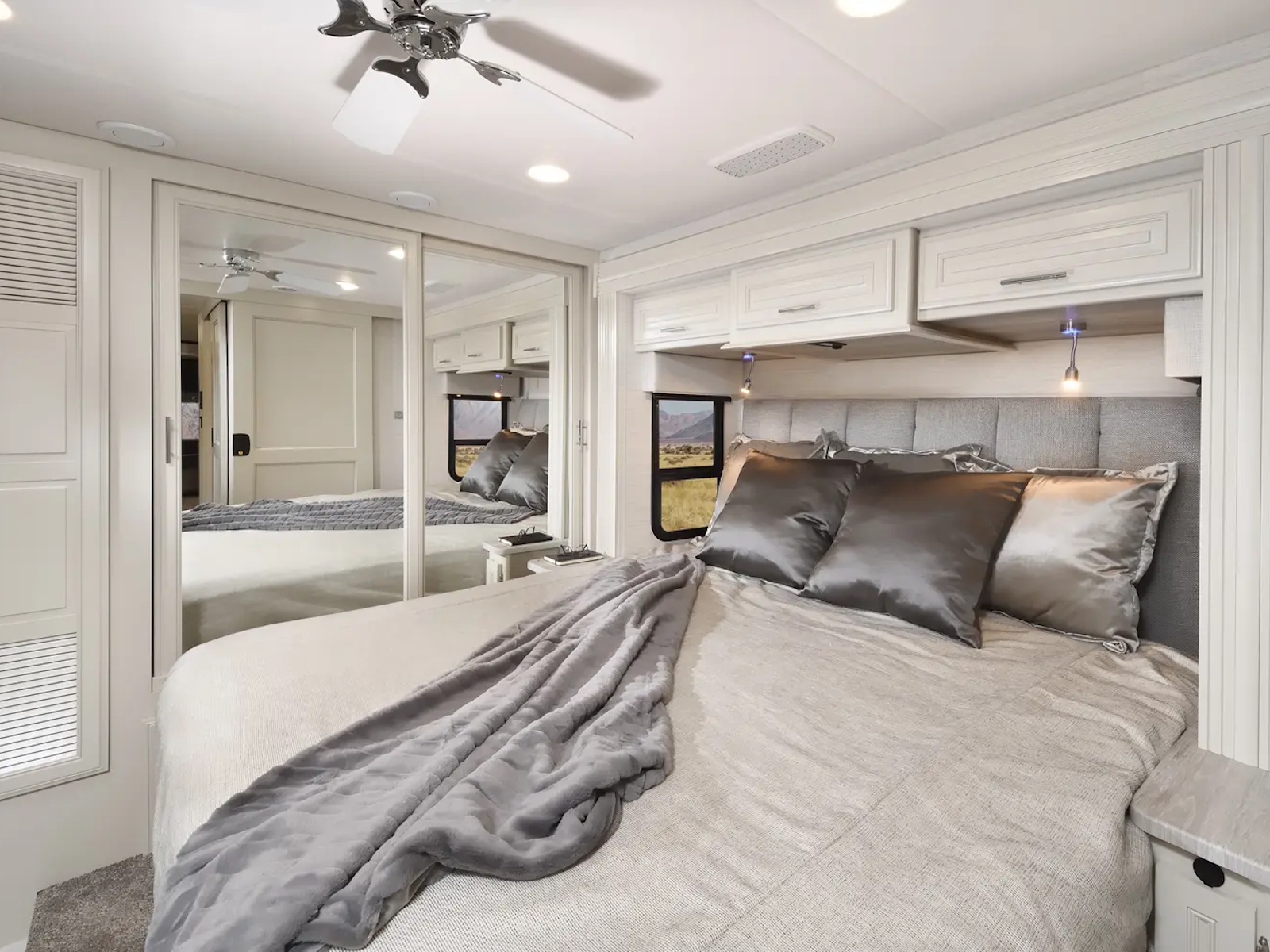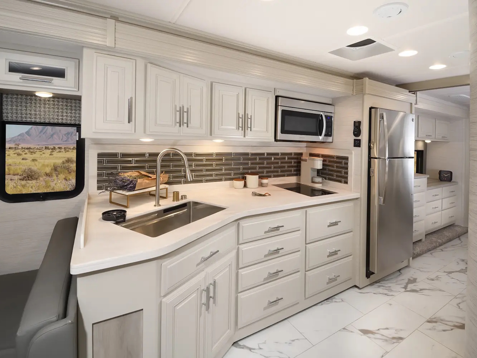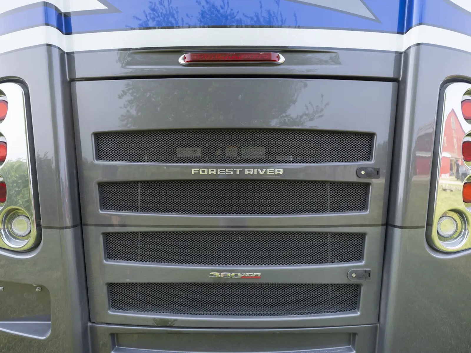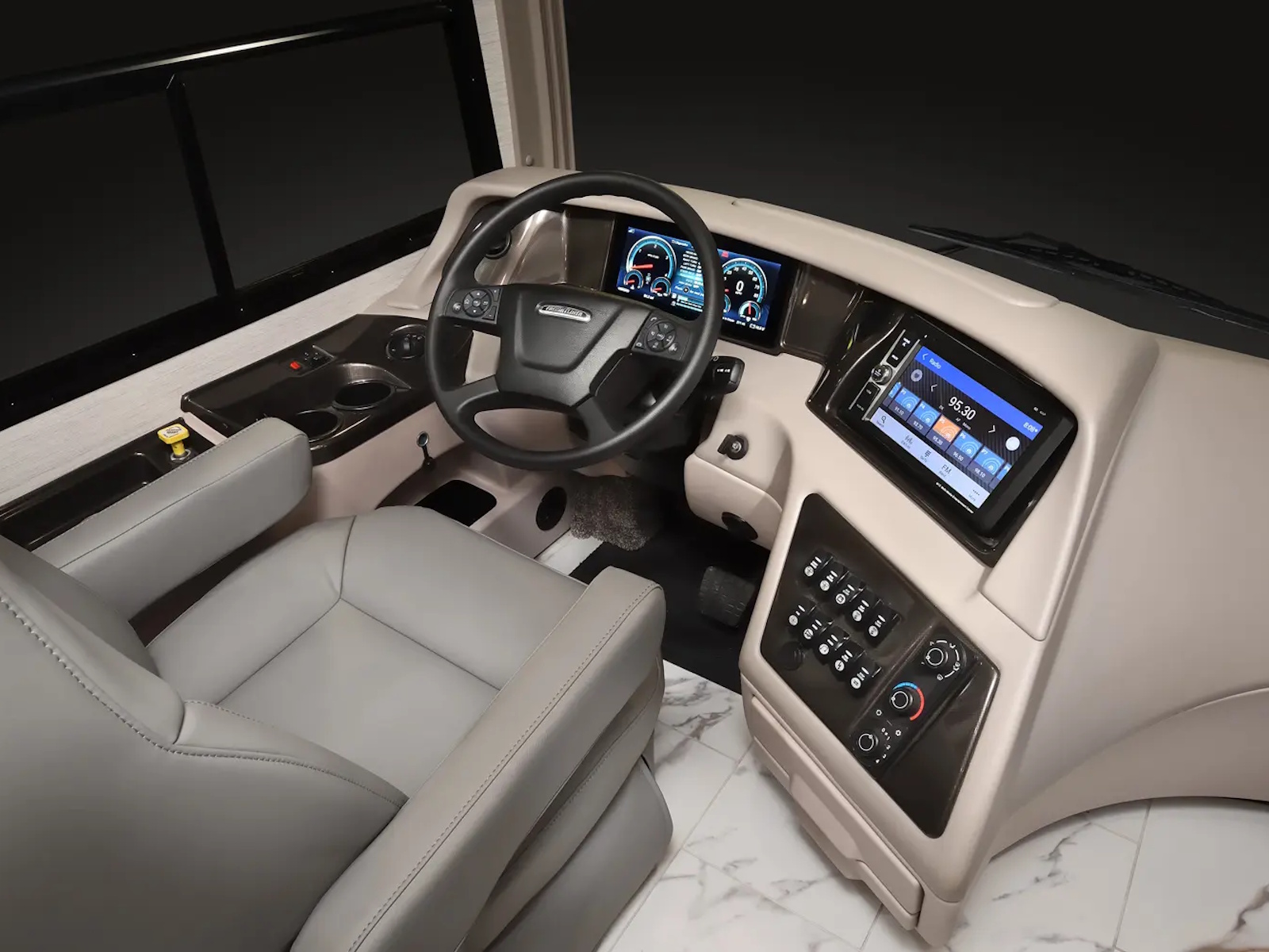 Experience luxury RV travel in a manageable size with the Berkshire 34B by Forest River. This Class A motorhome features three slides for ample space, a king-size Tilt-a-View bed, and a well-equipped kitchen. Perfect for comfortable and stylish road trips.