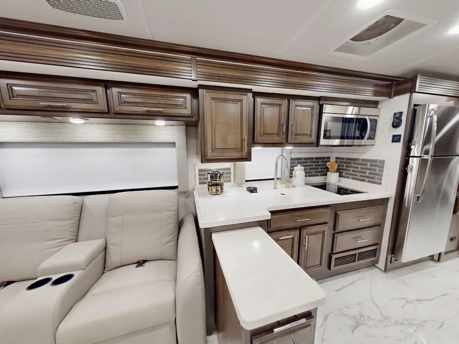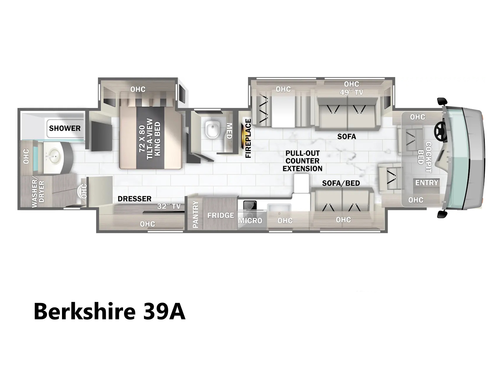 The Berkshire 39A by Forest River offers spacious and comfortable RV living with three slides, a king-size Tilt-a-View bed, a full rear bath, and a half bath. This luxurious Class A motorhome is perfect for extended road trips.