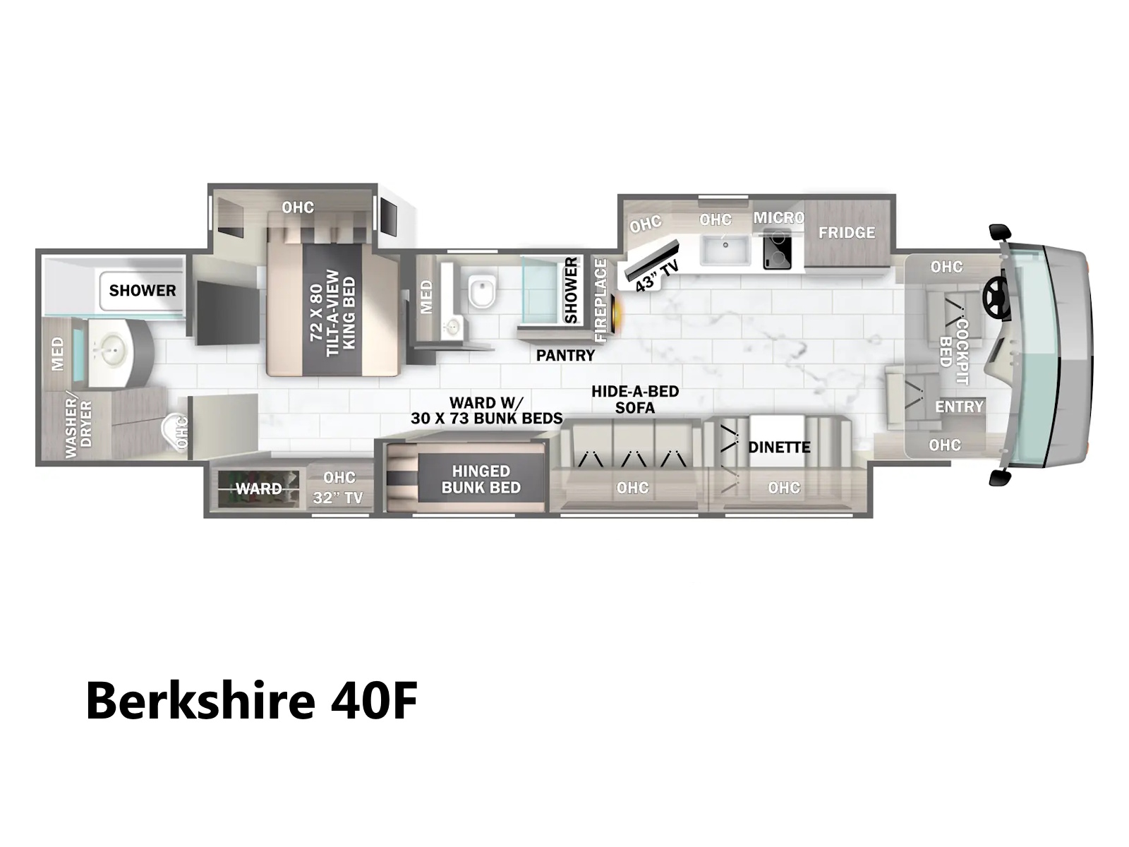The Berkshire 40F by Forest River is a luxurious bunkhouse motorhome with two full baths. Enjoy a king-size Tilt-a-View bed, a well-equipped kitchen with a residential refrigerator, and a unique drop-down overhead bed. This Class A RV is perfect for comfortable and stylish family travel.