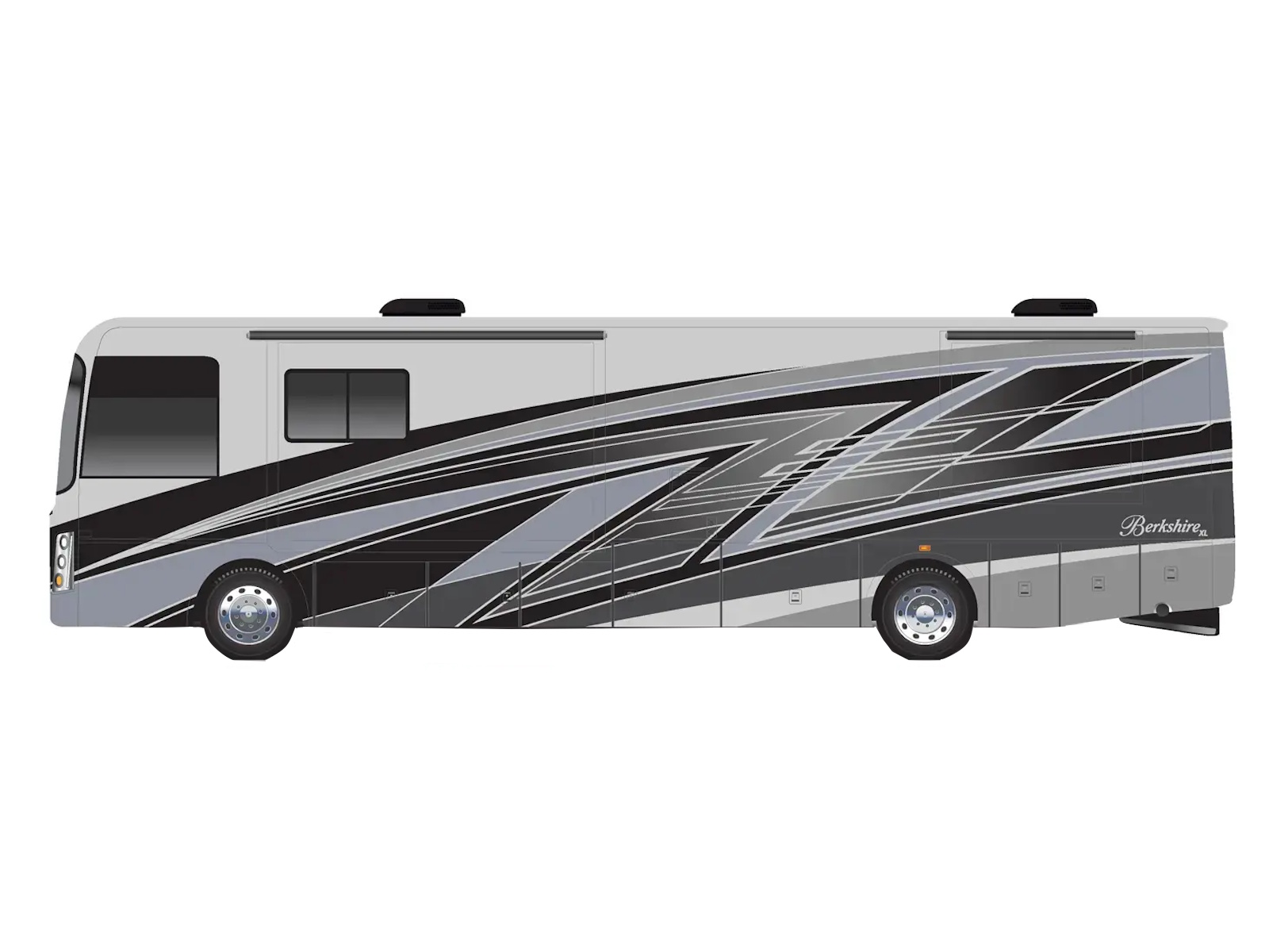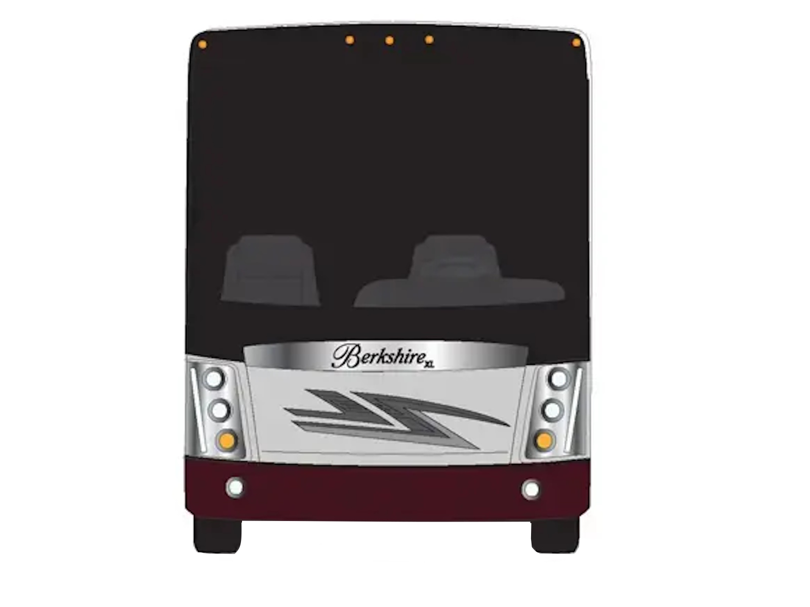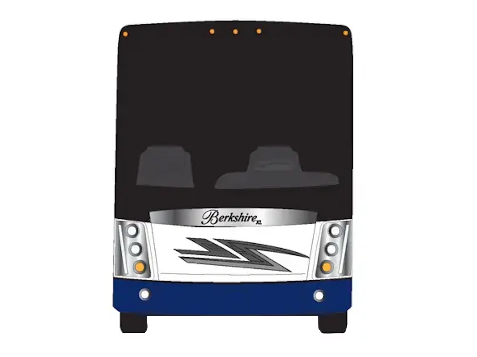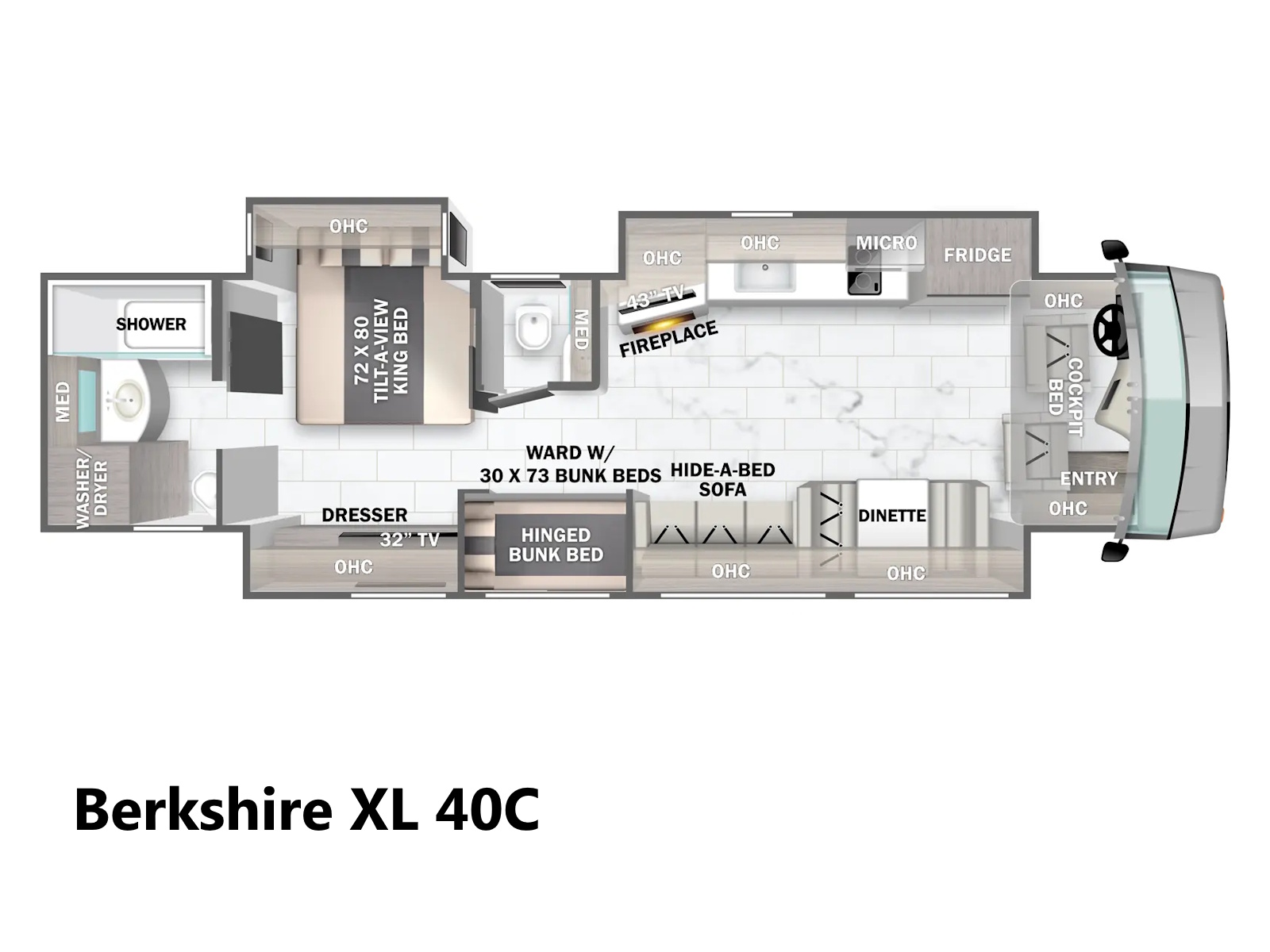 The Berkshire XL 40C is a three slide bunkhouse model with a full and a half bath. The rear full bath includes a shower, vanity sink with medicine cabinet, and stacking washer/dryer. The main bedroom has a slideout, 72" x 80" Tilt-a-View king bed, plus a dresser, wardrobe cabinet, TV, and overhead cupboards. The half bath has a vanity sink, medicine cabinet, and commode. Across from this bathroom is the bunk room/wardrobe combo.