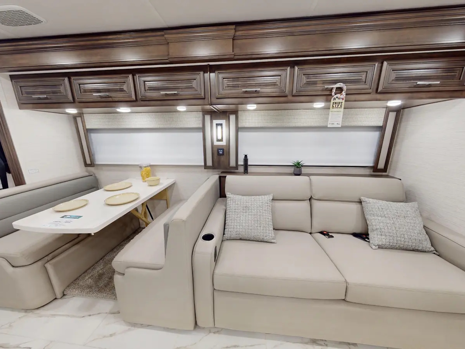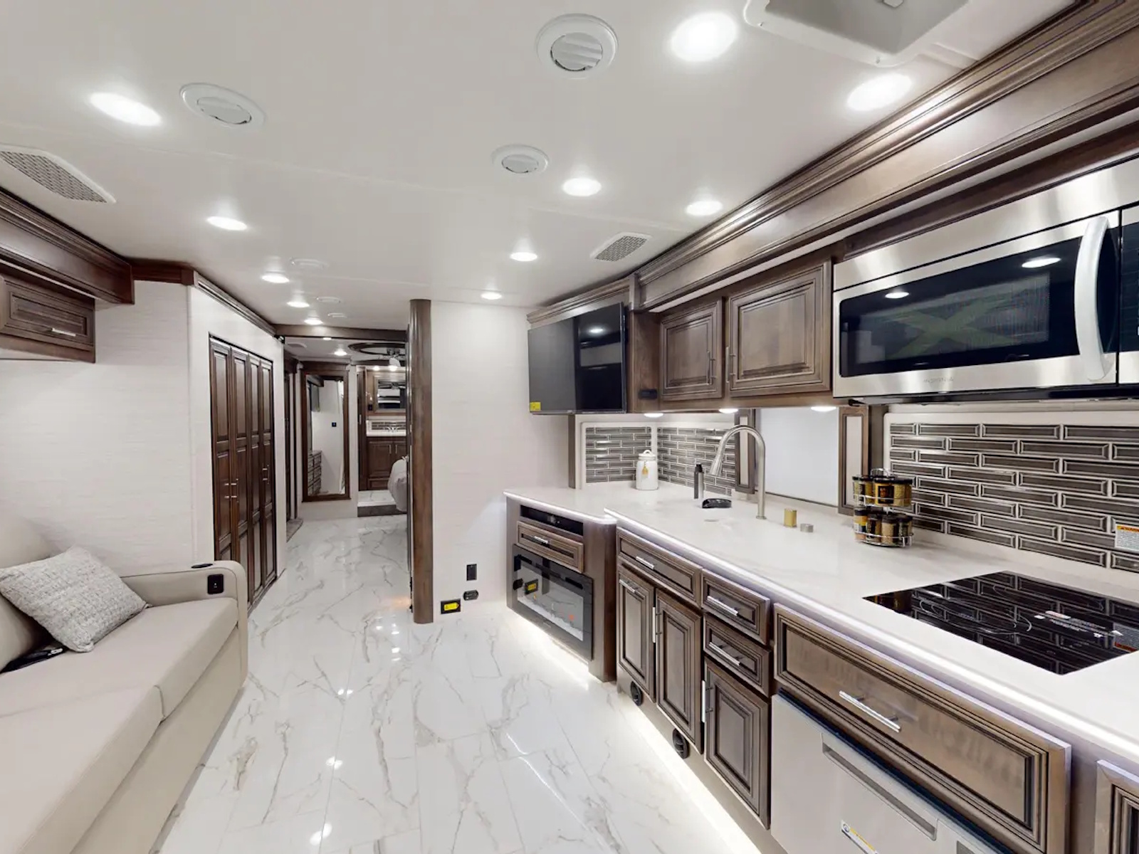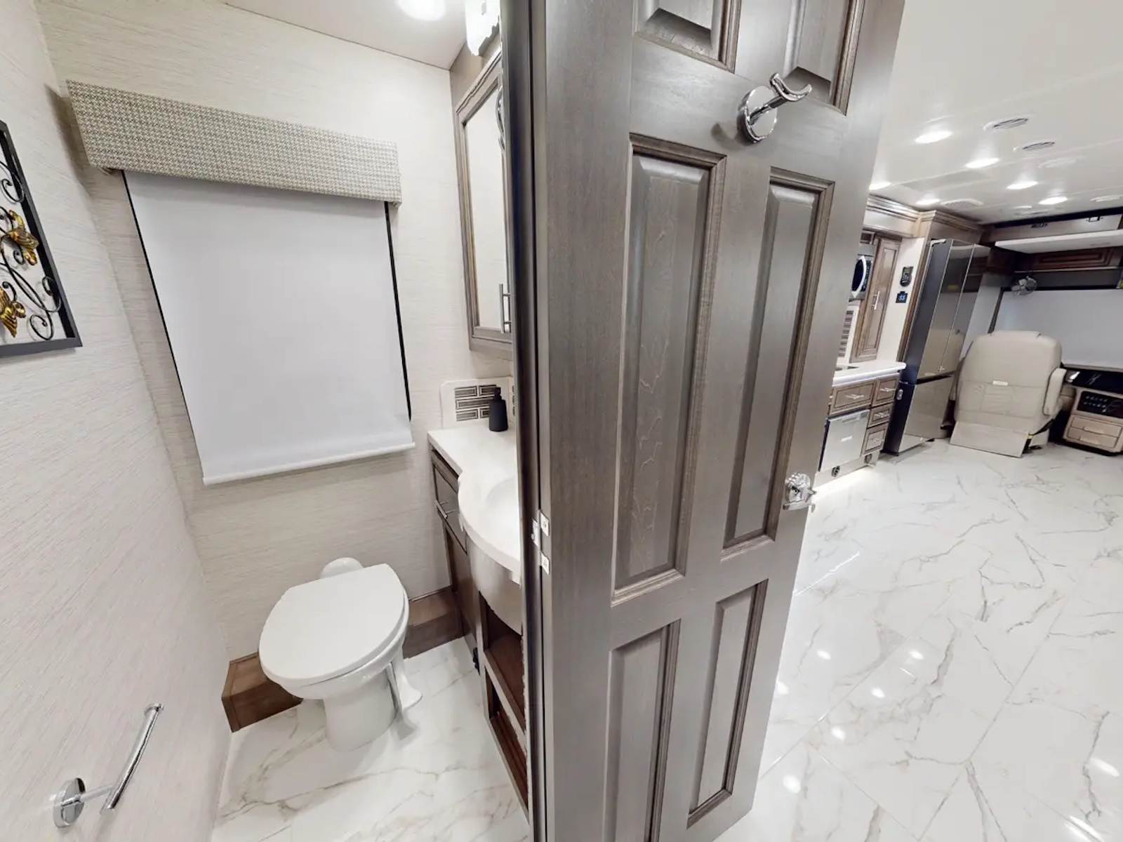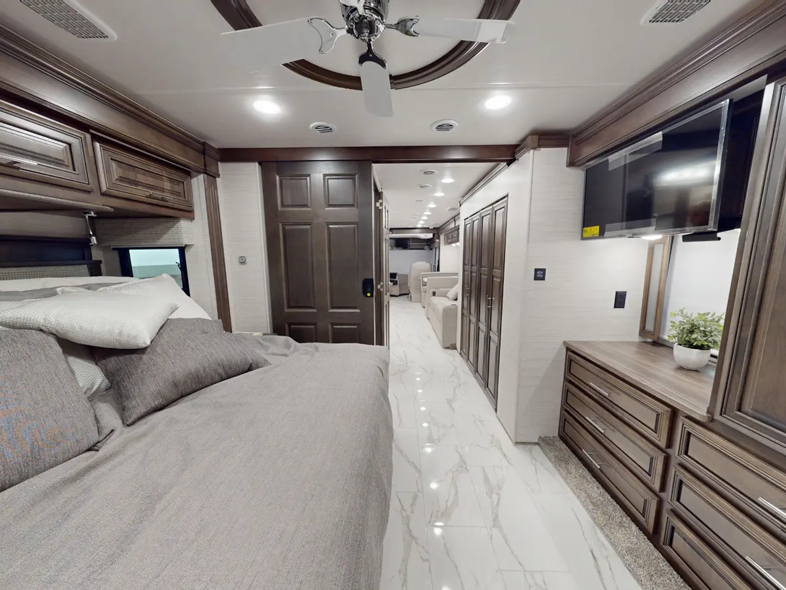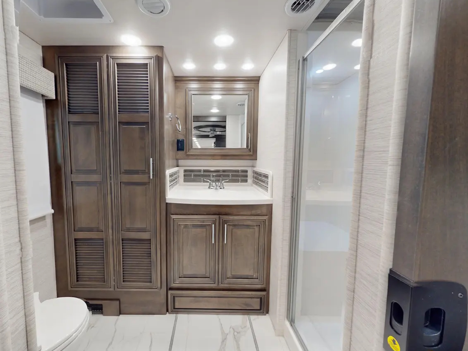 The Berkshire XL 40C is a three slide bunkhouse model with a full and a half bath. The rear full bath includes a shower, vanity sink with medicine cabinet, and stacking washer/dryer. The main bedroom has a slideout, 72" x 80" Tilt-a-View king bed, plus a dresser, wardrobe cabinet, TV, and overhead cupboards. The half bath has a vanity sink, medicine cabinet, and commode. Across from this bathroom is the bunk room/wardrobe combo.