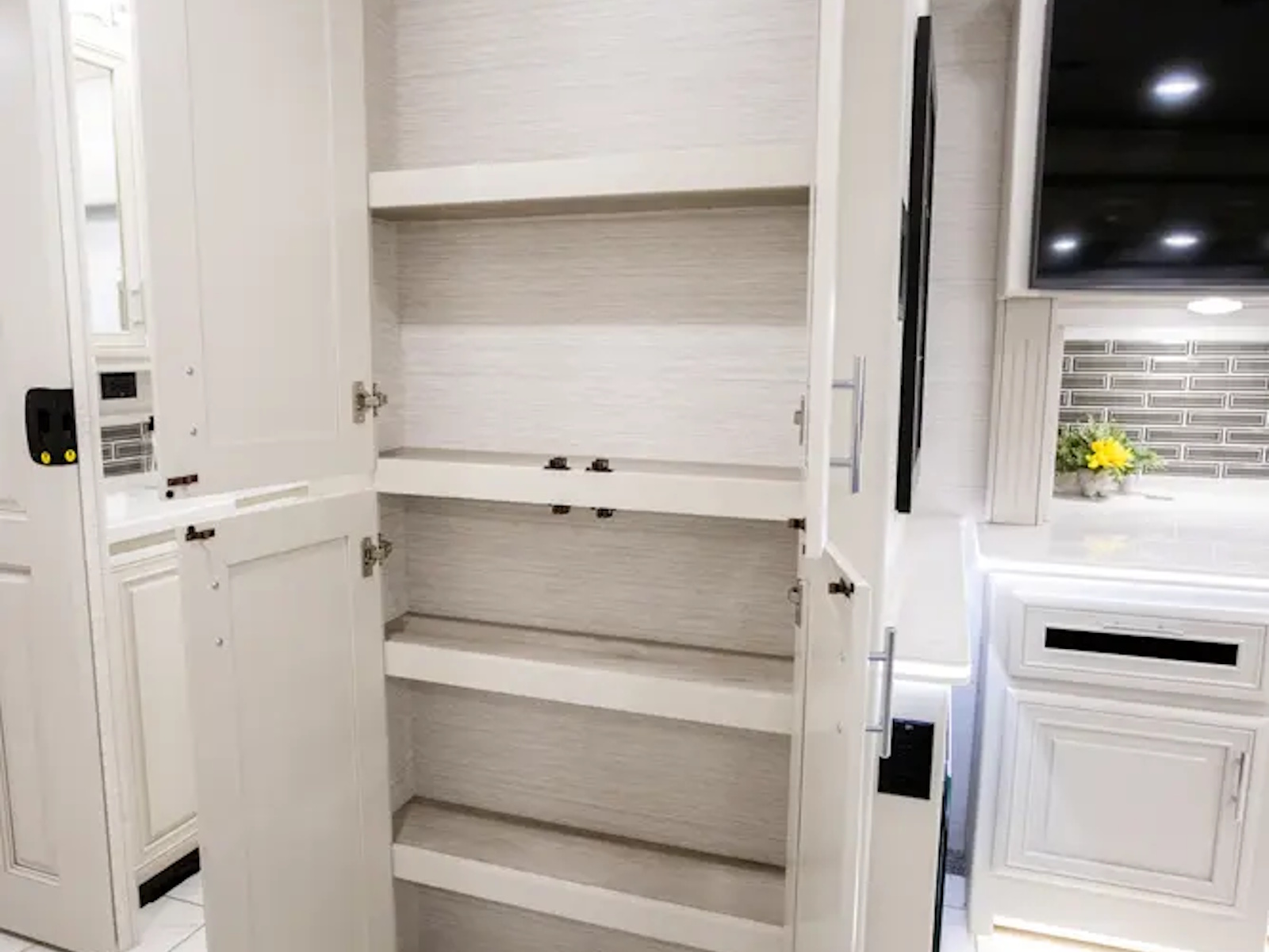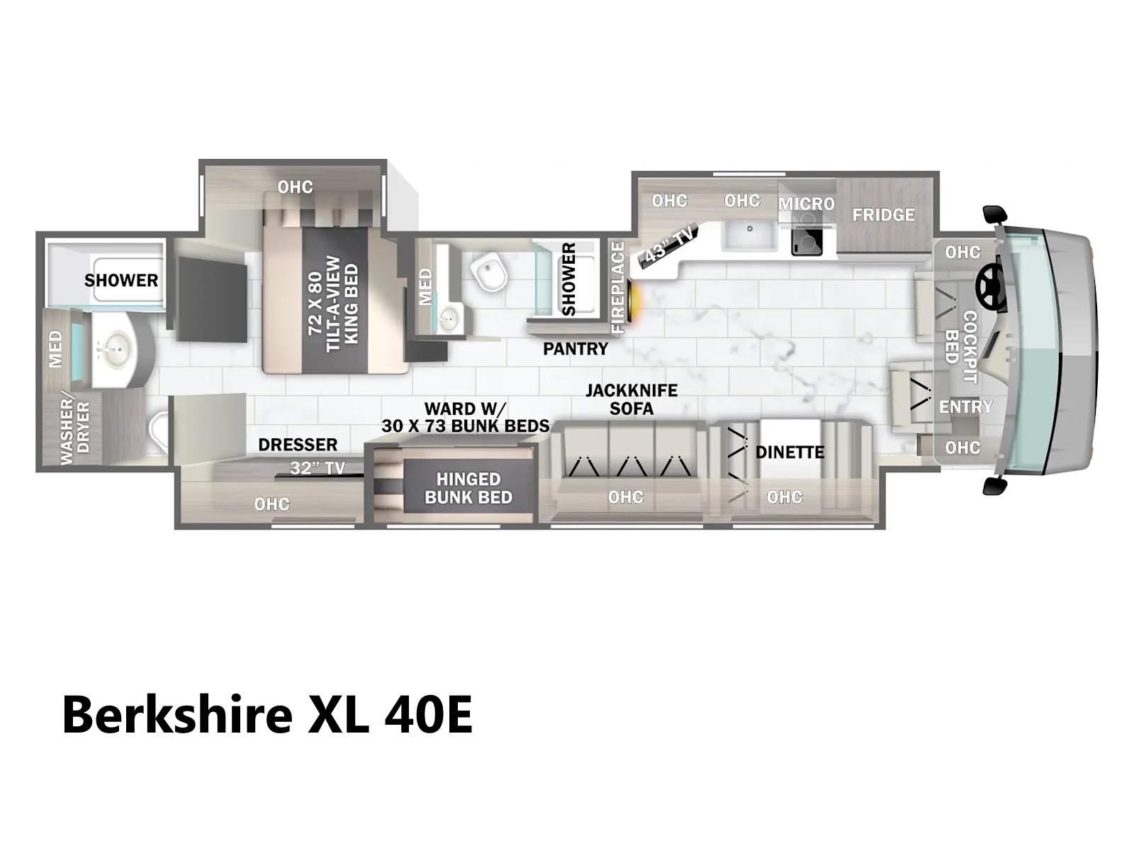 The Berkshire XL 40E is a three-slide bunkhouse model with two full bathrooms. The rear full bath includes a shower, vanity sink with medicine cabinet, and stacking washer/dryer. The bedroom has a slideout, 72" x 80" Tilt-a-View king bed, plus a dresser, wardrobe cabinet, TV, and overhead cupboard. The second full bath sits across from the bunk room/wardrobe combo. The kitchen is fully equipped, with a convection microwave, induction cooktop, and residential-style refrigerator.