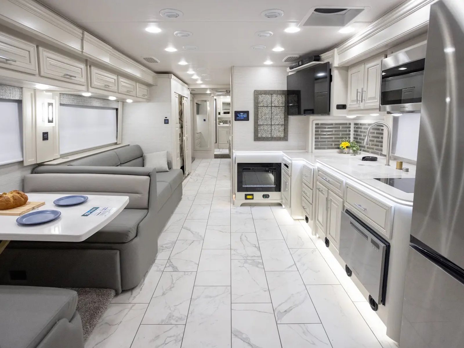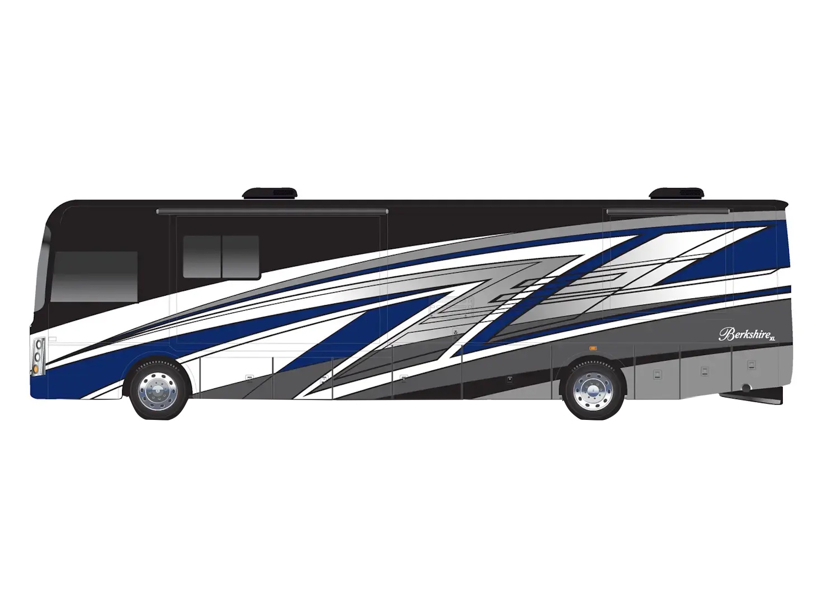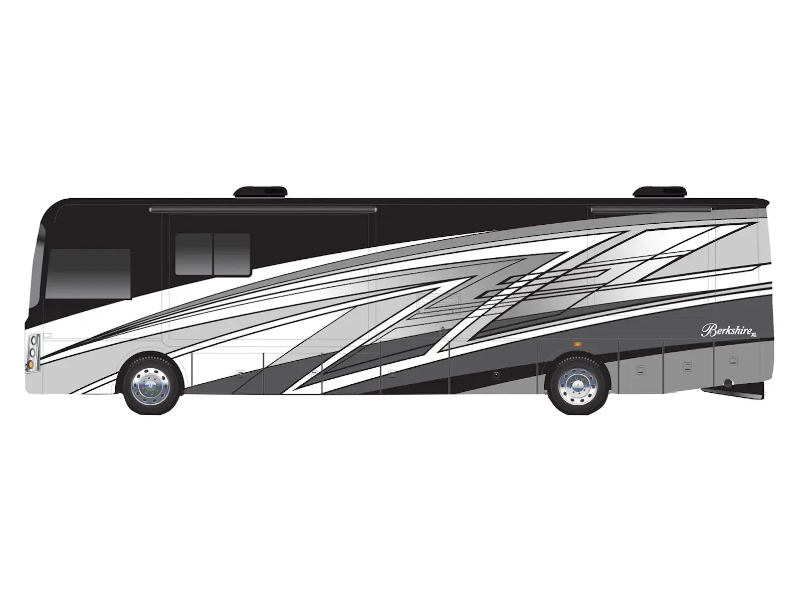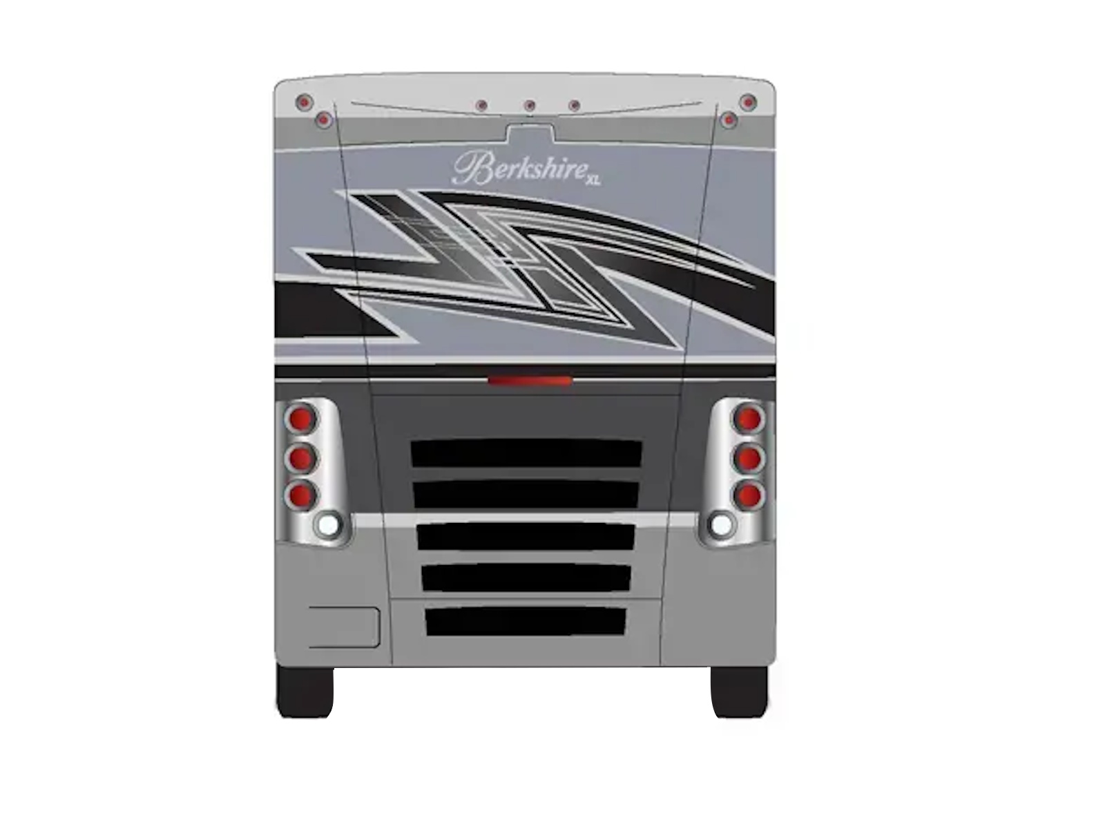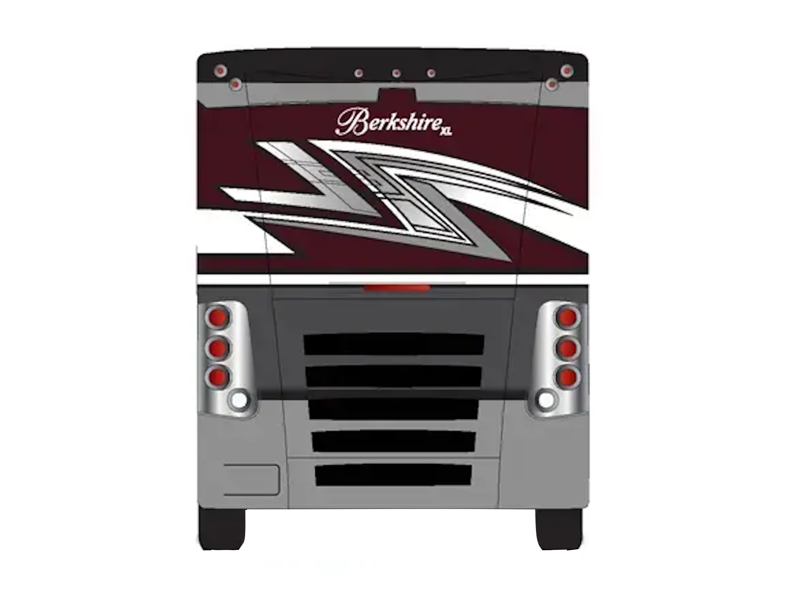 The Berkshire XL 40E is a three-slide bunkhouse model with two full bathrooms. The rear full bath includes a shower, vanity sink with medicine cabinet, and stacking washer/dryer. The bedroom has a slideout, 72" x 80" Tilt-a-View king bed, plus a dresser, wardrobe cabinet, TV, and overhead cupboard. The second full bath sits across from the bunk room/wardrobe combo. The kitchen is fully equipped, with a convection microwave, induction cooktop, and residential-style refrigerator.