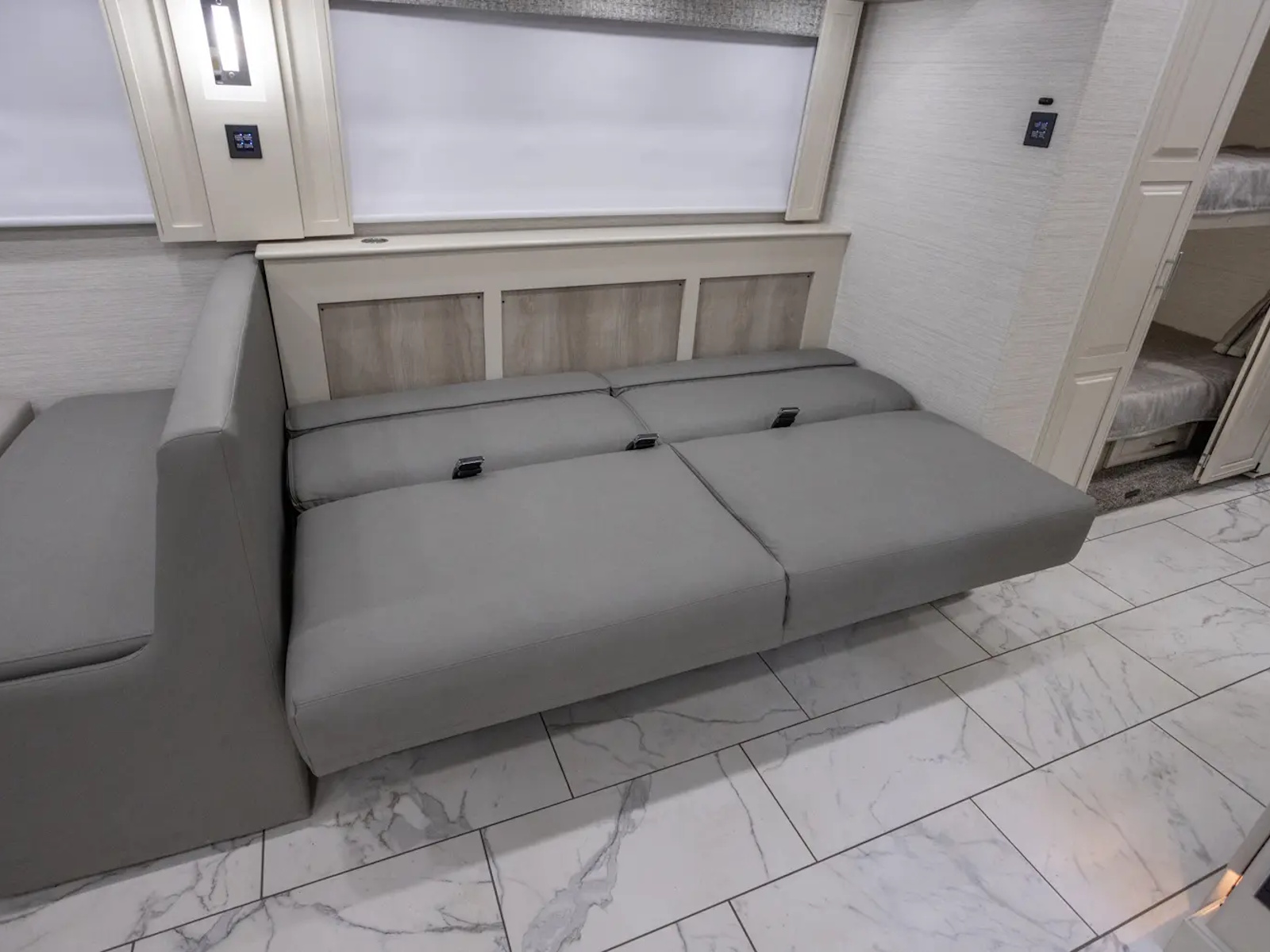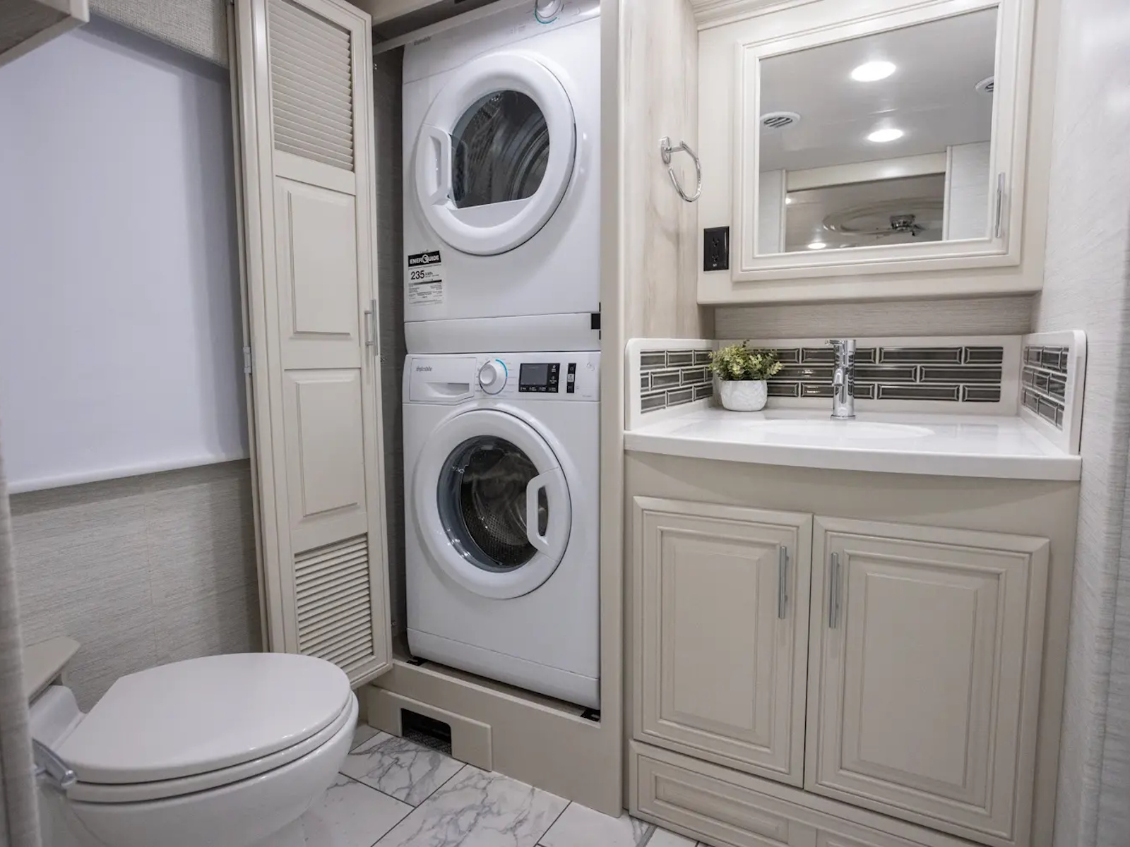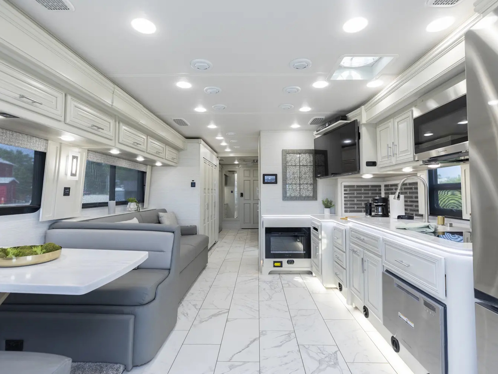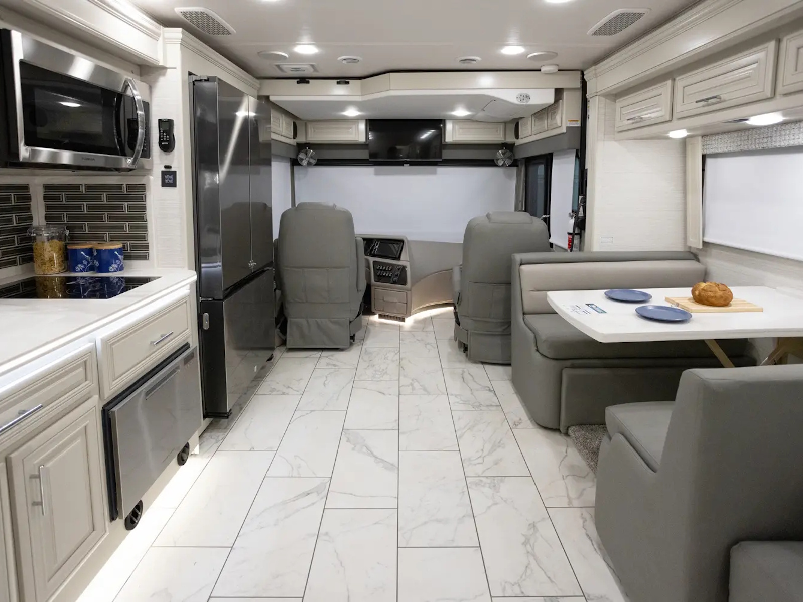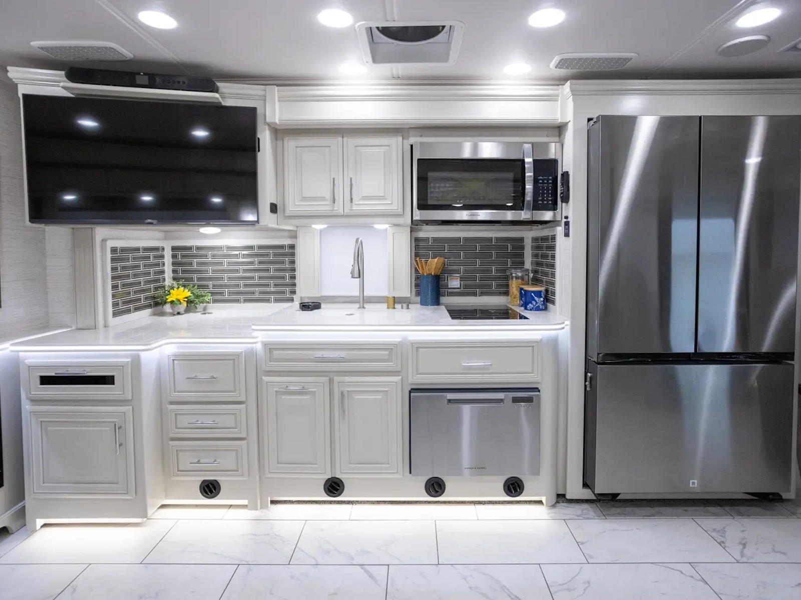 The Berkshire XL 40E is a three-slide bunkhouse model with two full bathrooms. The rear full bath includes a shower, vanity sink with medicine cabinet, and stacking washer/dryer. The bedroom has a slideout, 72" x 80" Tilt-a-View king bed, plus a dresser, wardrobe cabinet, TV, and overhead cupboard. The second full bath sits across from the bunk room/wardrobe combo. The kitchen is fully equipped, with a convection microwave, induction cooktop, and residential-style refrigerator.