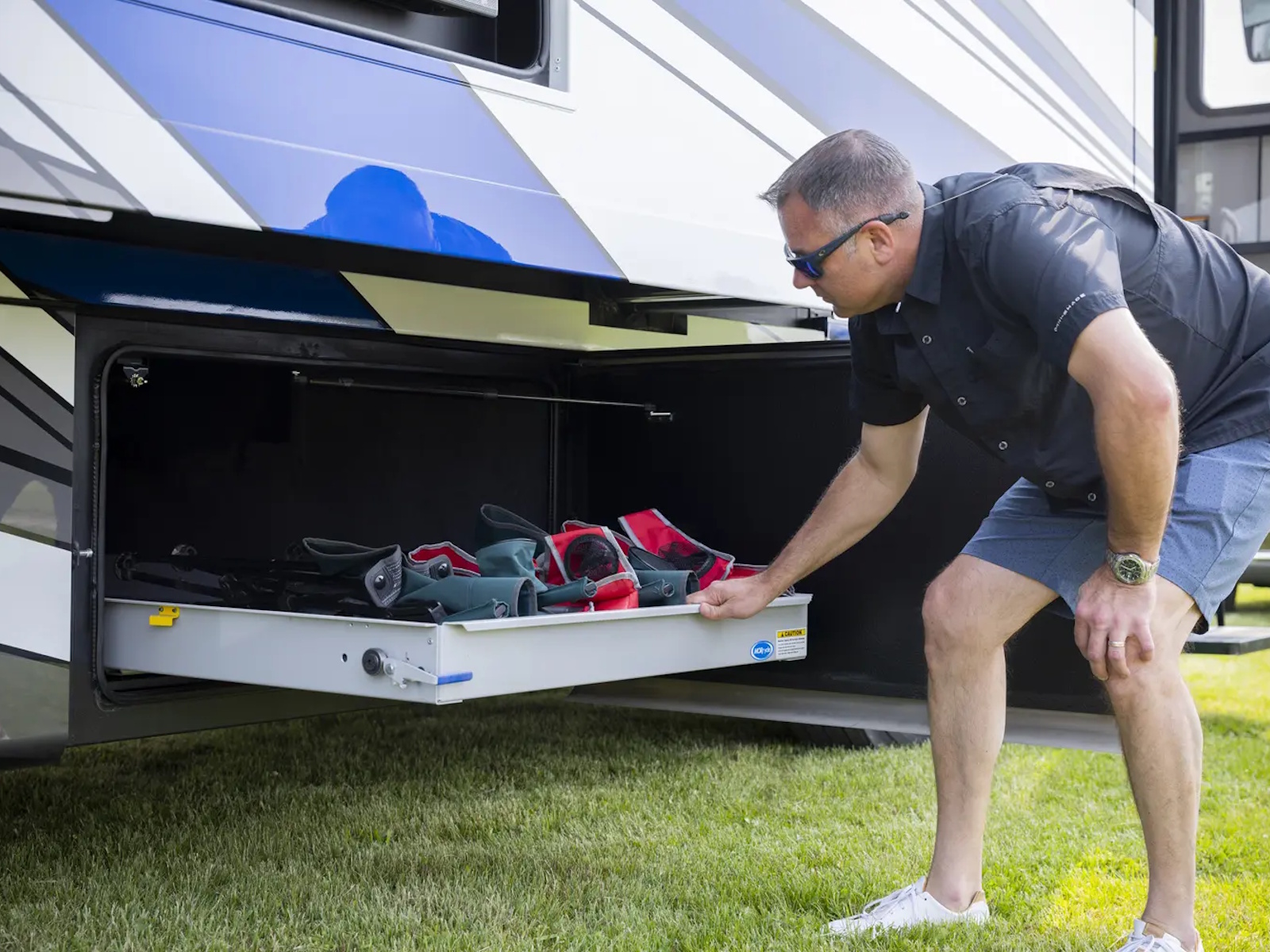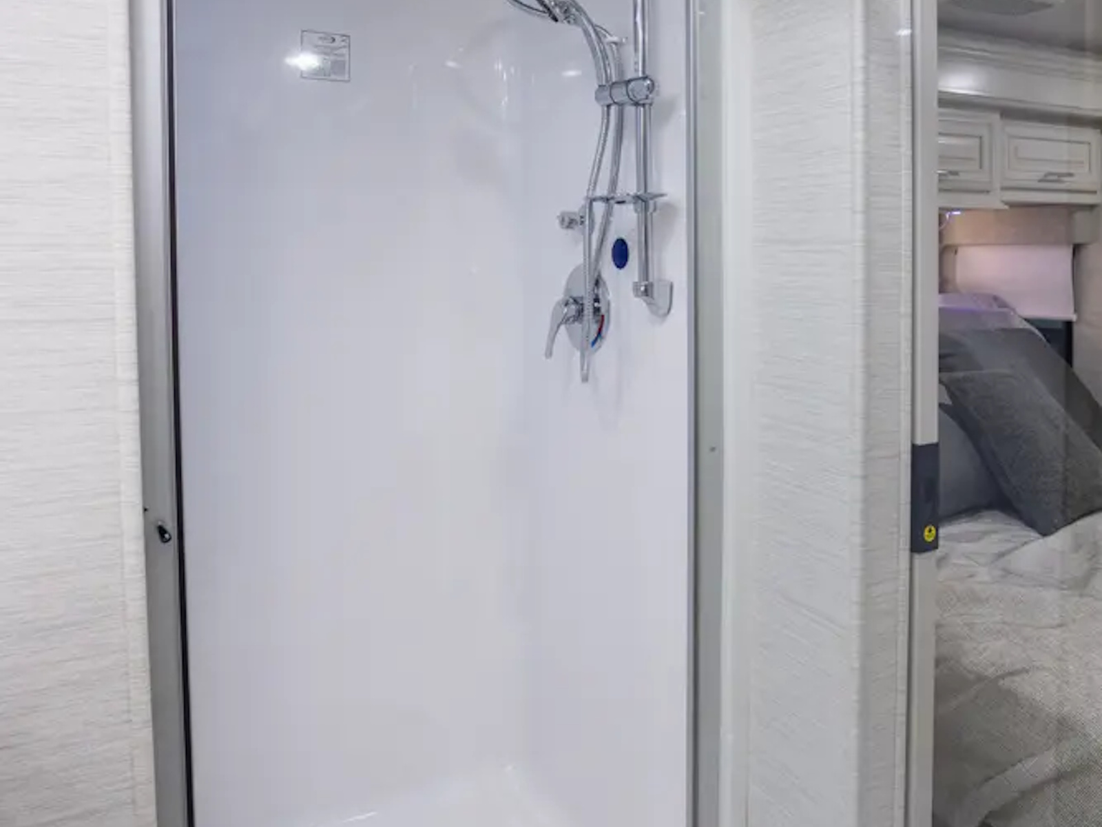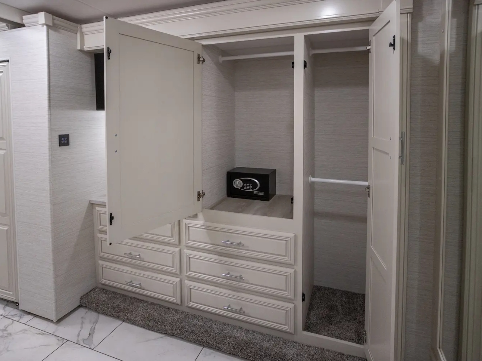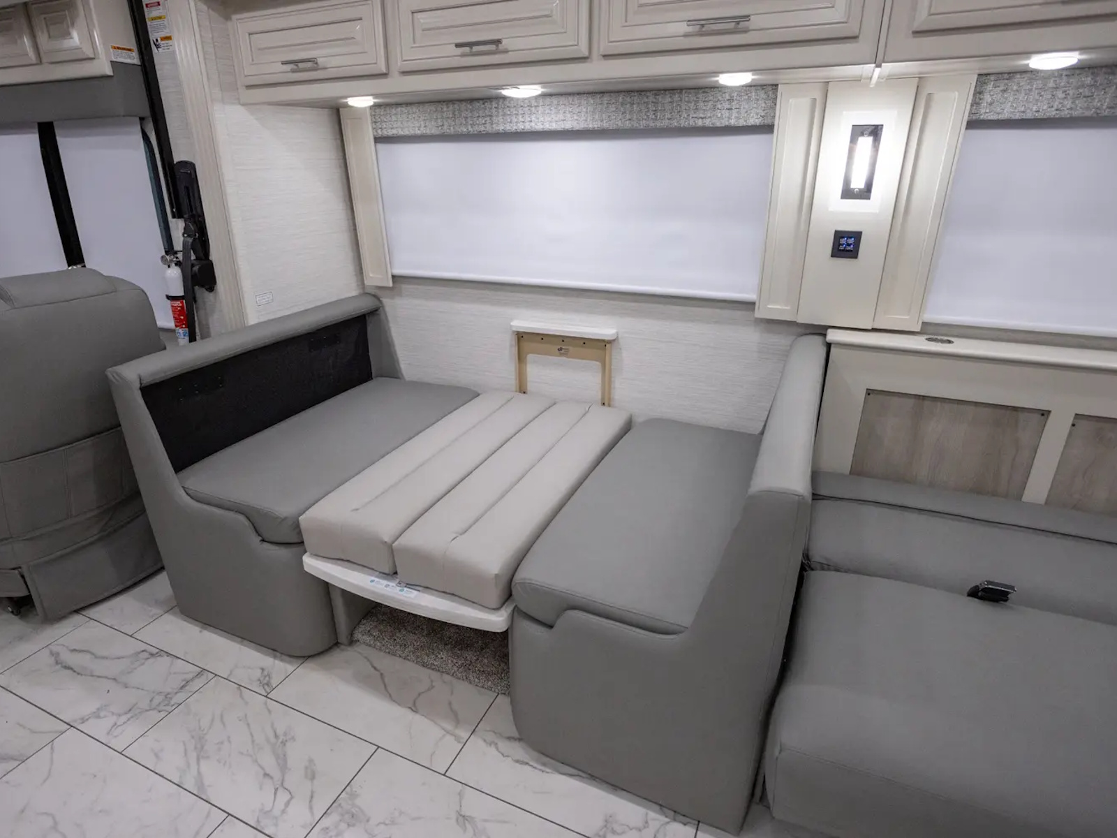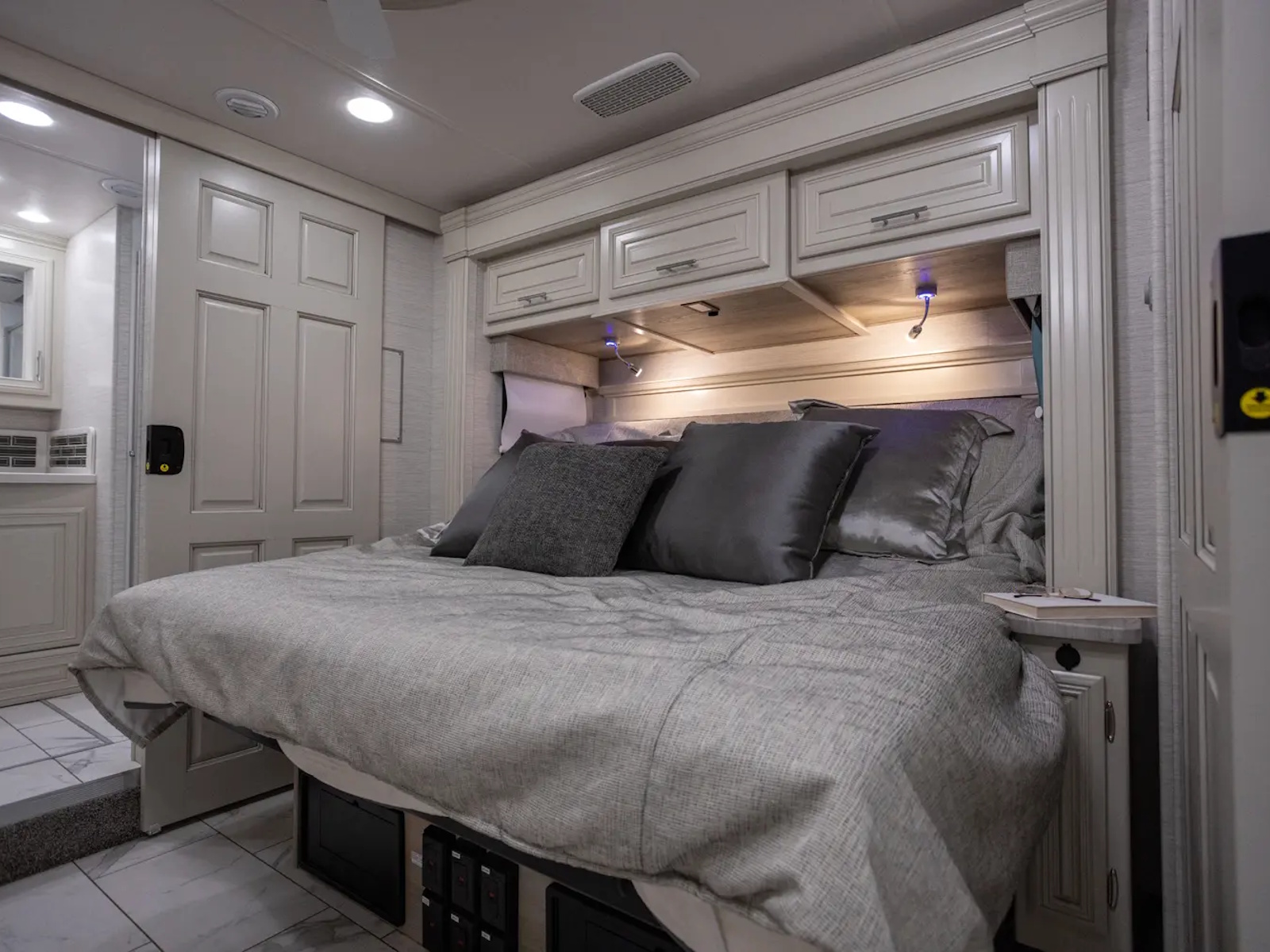The Berkshire XL 40E is a three-slide bunkhouse model with two full bathrooms. The rear full bath includes a shower, vanity sink with medicine cabinet, and stacking washer/dryer. The bedroom has a slideout, 72" x 80" Tilt-a-View king bed, plus a dresser, wardrobe cabinet, TV, and overhead cupboard. The second full bath sits across from the bunk room/wardrobe combo. The kitchen is fully equipped, with a convection microwave, induction cooktop, and residential-style refrigerator.