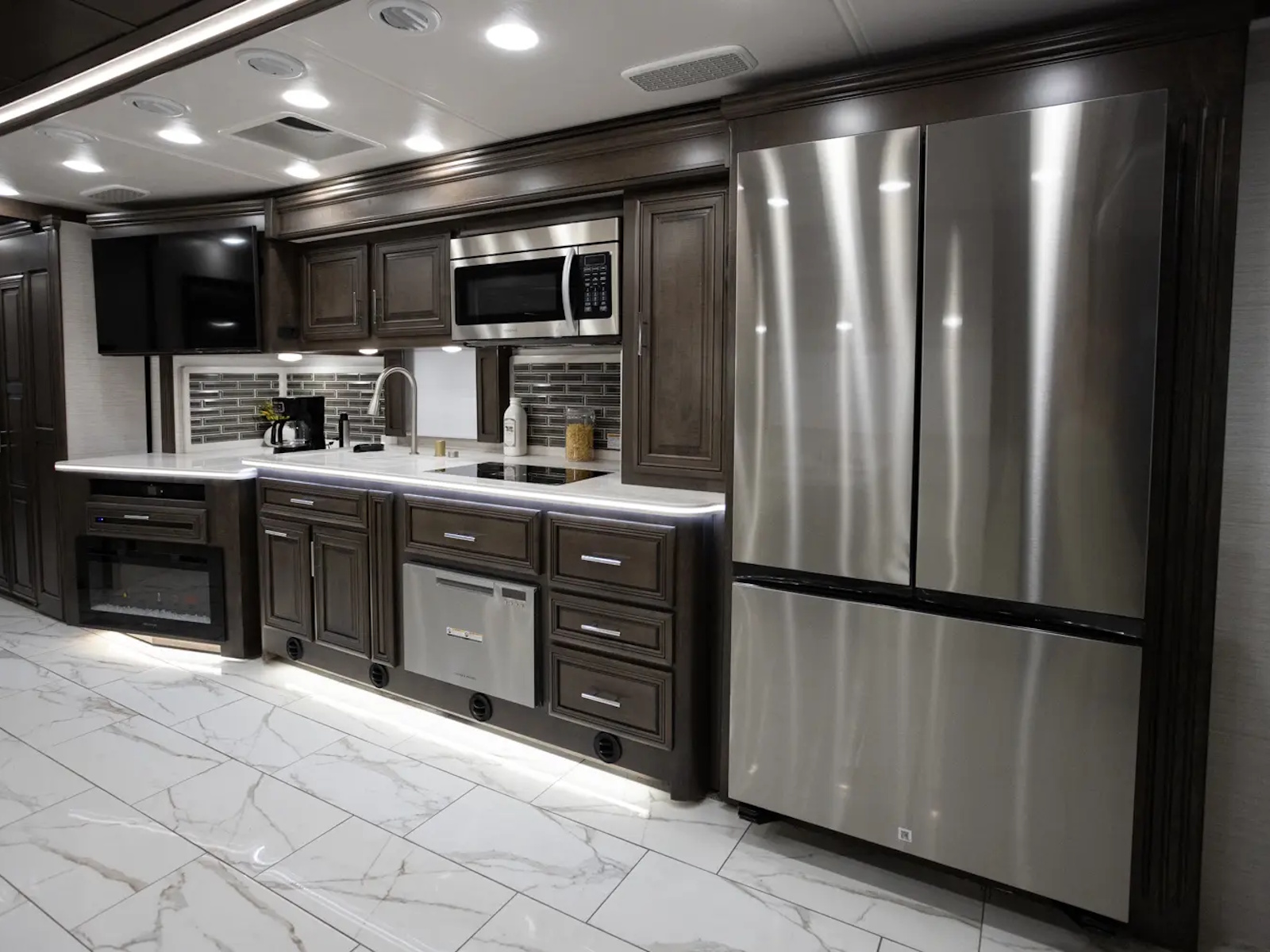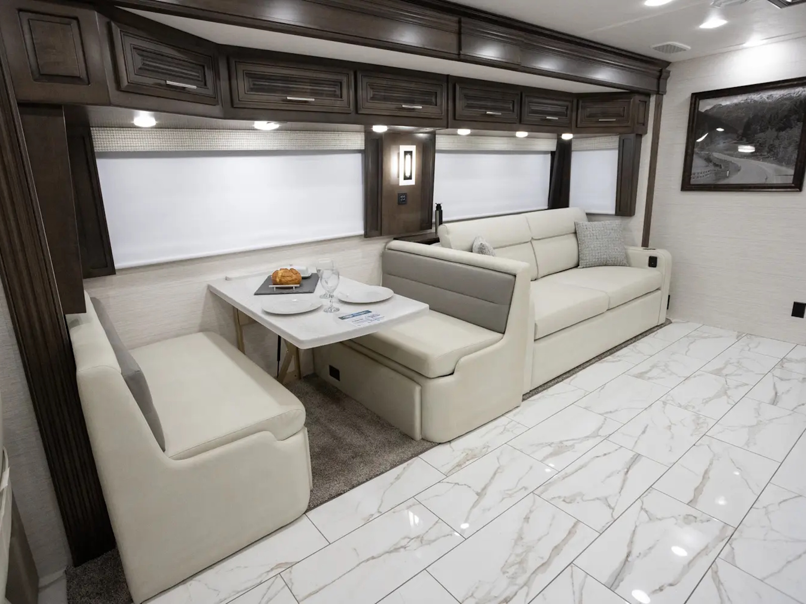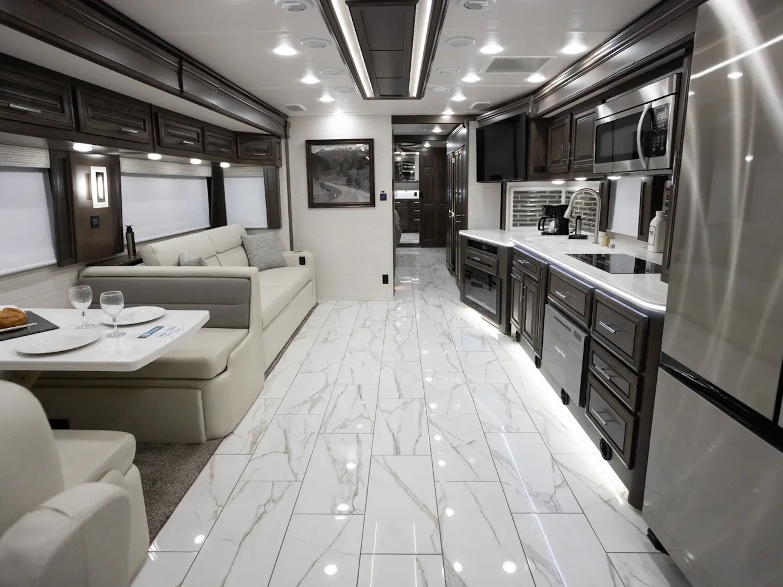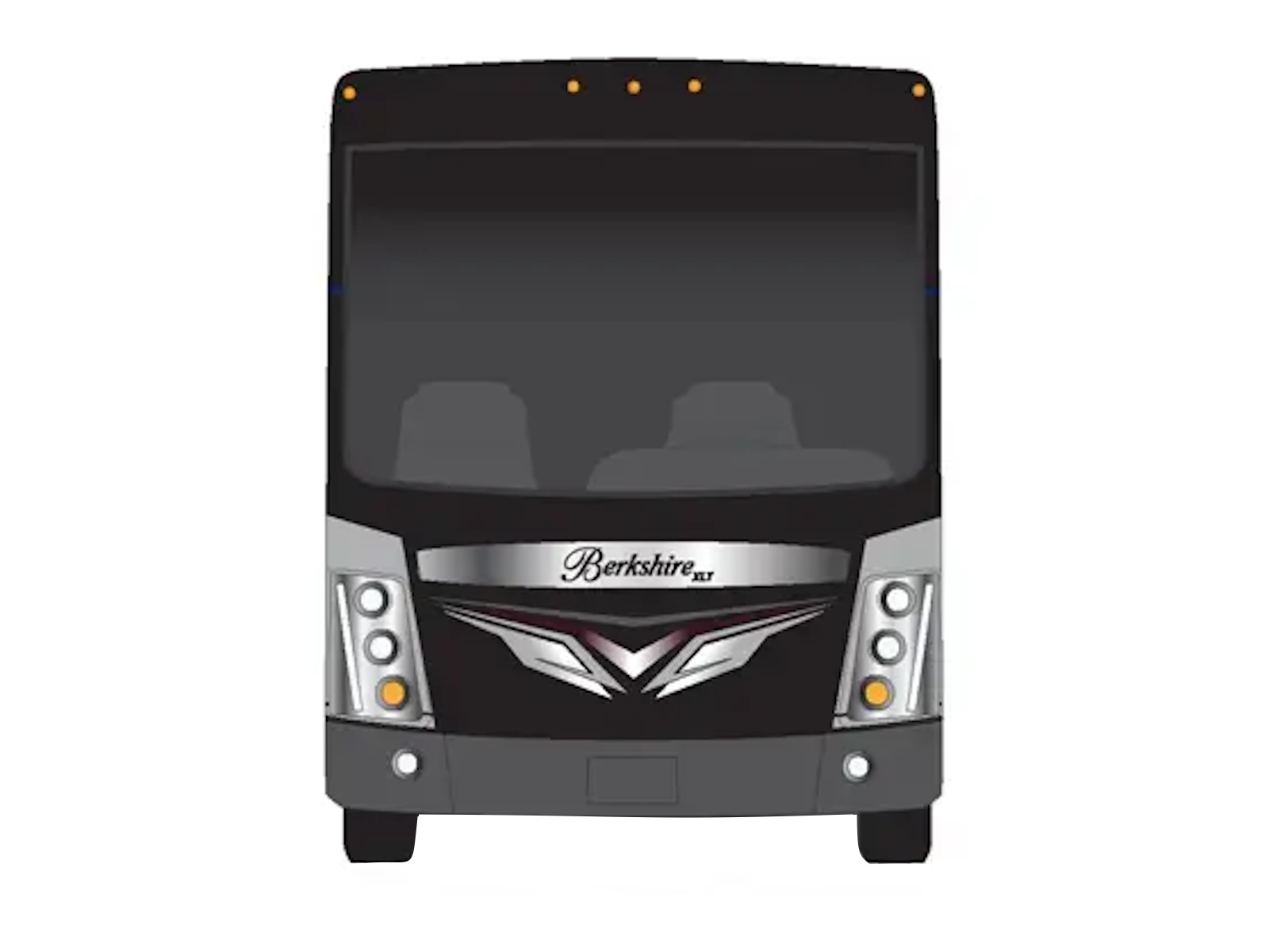 The Berkshire XLT 45A is a four-slide bunkhouse model with two full bathrooms. The rear large full bath includes a shower, vanity with dual sinks, overhead cabinets, and stacking washer/dryer. The main bedroom has a slideout, 72" x 80" Tilt-a-View king bed, plus a dresser, wardrobe cabinet, 43" TV, and overhead cupboards. The second full bath has a shower, vanity sink, medicine cabinet, and commode. Across across from this bathroom is the bunk room/wardrobe combo. The kitchen provides a convection microwave, induction cooktop, and residential-style refrigerator. Just over the cockpit, you'll find a unique drop-down bed that provides an additional sleeping surface at night.