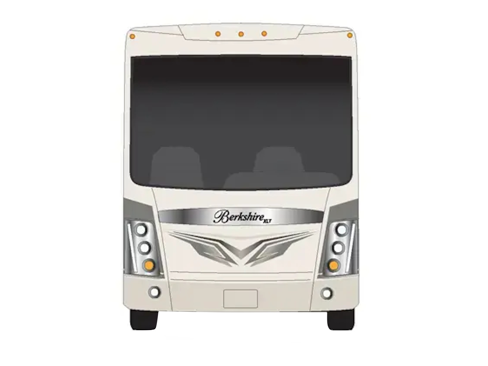 The Berkshire XLT 45A is a four-slide bunkhouse model with two full bathrooms. The rear large full bath includes a shower, vanity with dual sinks, overhead cabinets, and stacking washer/dryer. The main bedroom has a slideout, 72" x 80" Tilt-a-View king bed, plus a dresser, wardrobe cabinet, 43" TV, and overhead cupboards. The second full bath has a shower, vanity sink, medicine cabinet, and commode. Across across from this bathroom is the bunk room/wardrobe combo. The kitchen provides a convection microwave, induction cooktop, and residential-style refrigerator. Just over the cockpit, you'll find a unique drop-down bed that provides an additional sleeping surface at night.