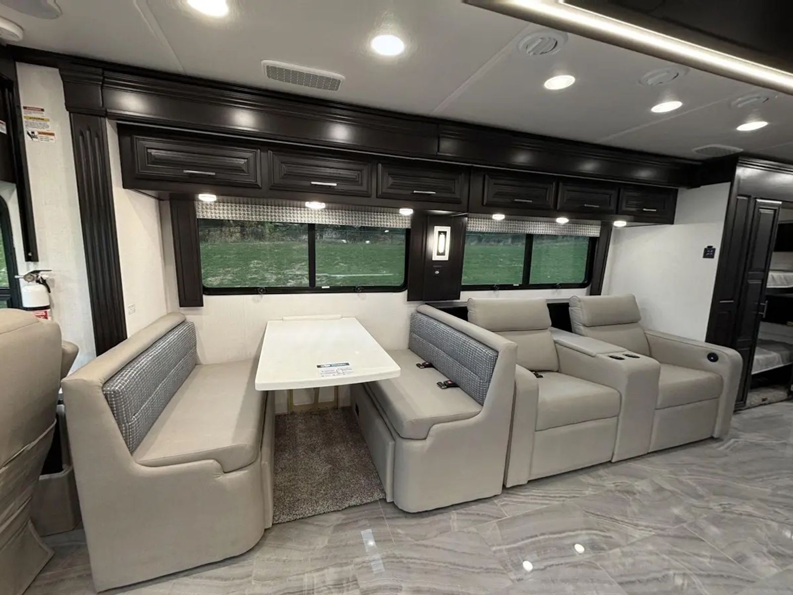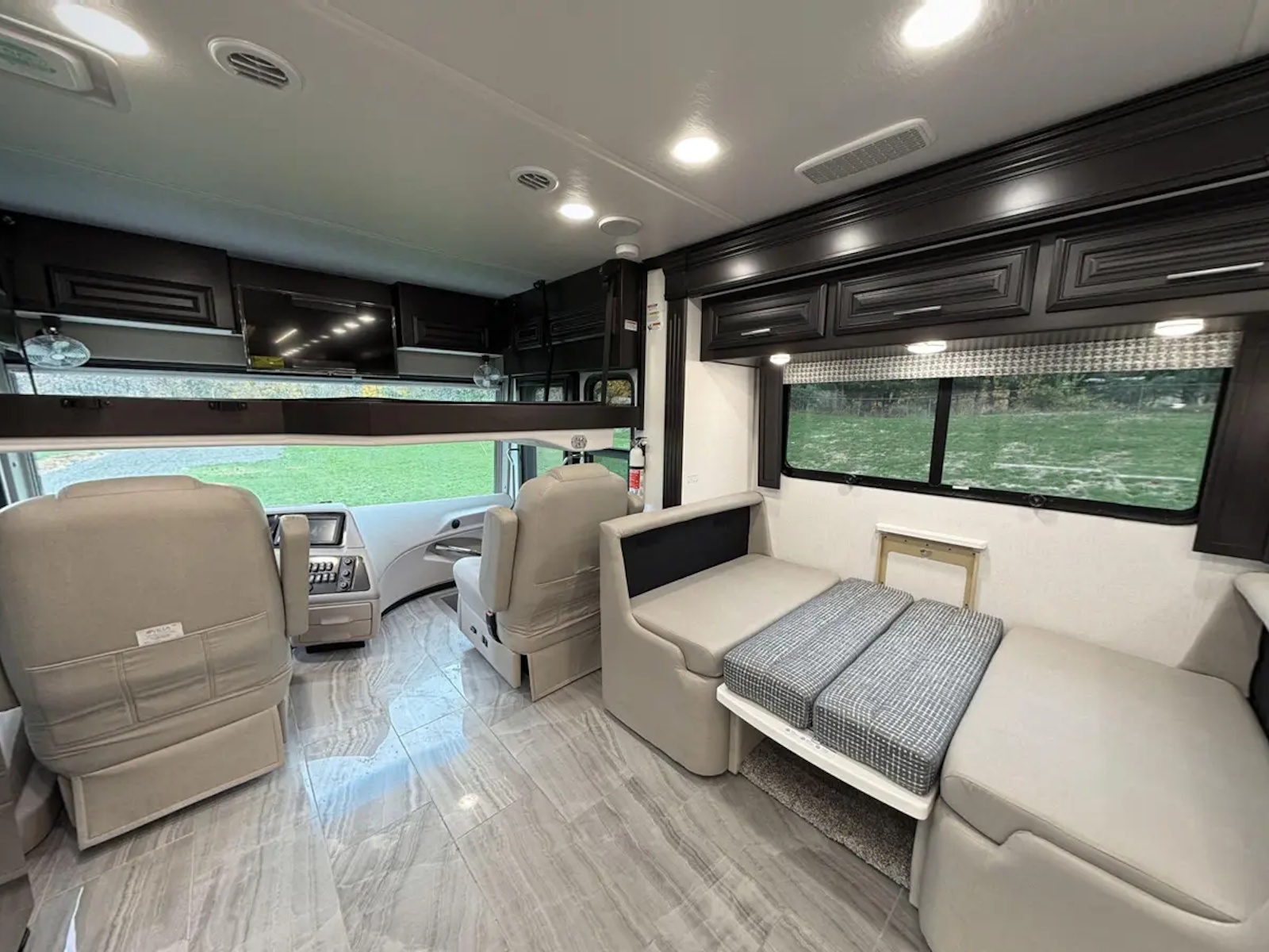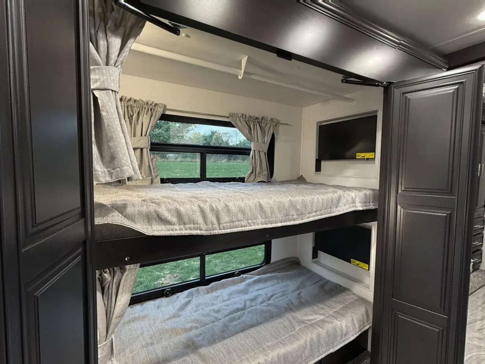 The Berkshire XLT 45CA is a three-slide bunkhouse model with two full bathrooms. The large full rear bath includes a roomy shower, vanity with dual sinks overhead cabinets, and stacking washer/dryer. The main bedroom is just off the bath, with a slideout, 72" x 80" Tilt-a-View king bed, plus a dresser, wardrobe cabinet, 43" TV, and overhead cupboards. The second full bath has a shower, vanity sink, medicine cabinet, and commode. Across across from this bathroom is the bunk room/wardrobe combo. The kitchen is fully equipped, with a convection microwave, induction cooktop, and residential-style refrigerator. Just over the cockpit, you'll find a unique drop-down bed for an added sleeping surfac