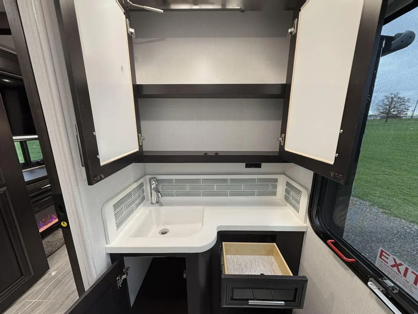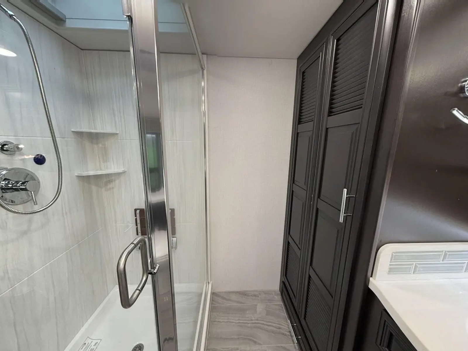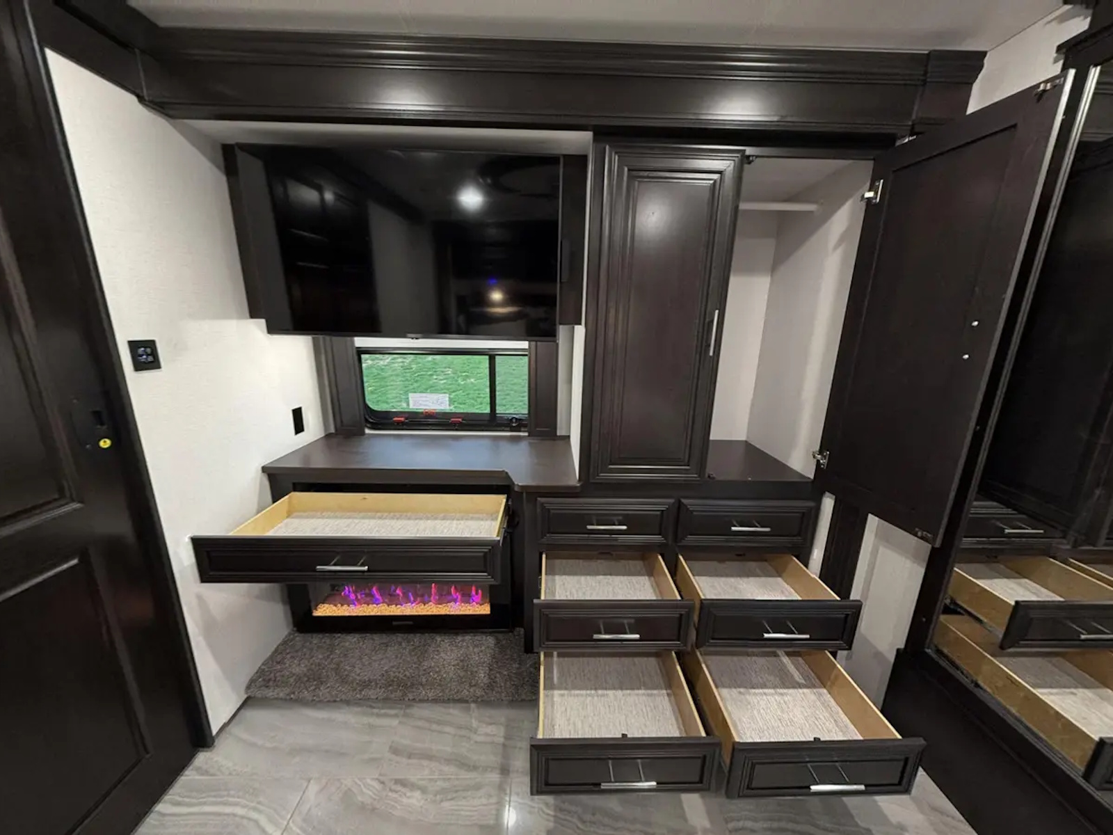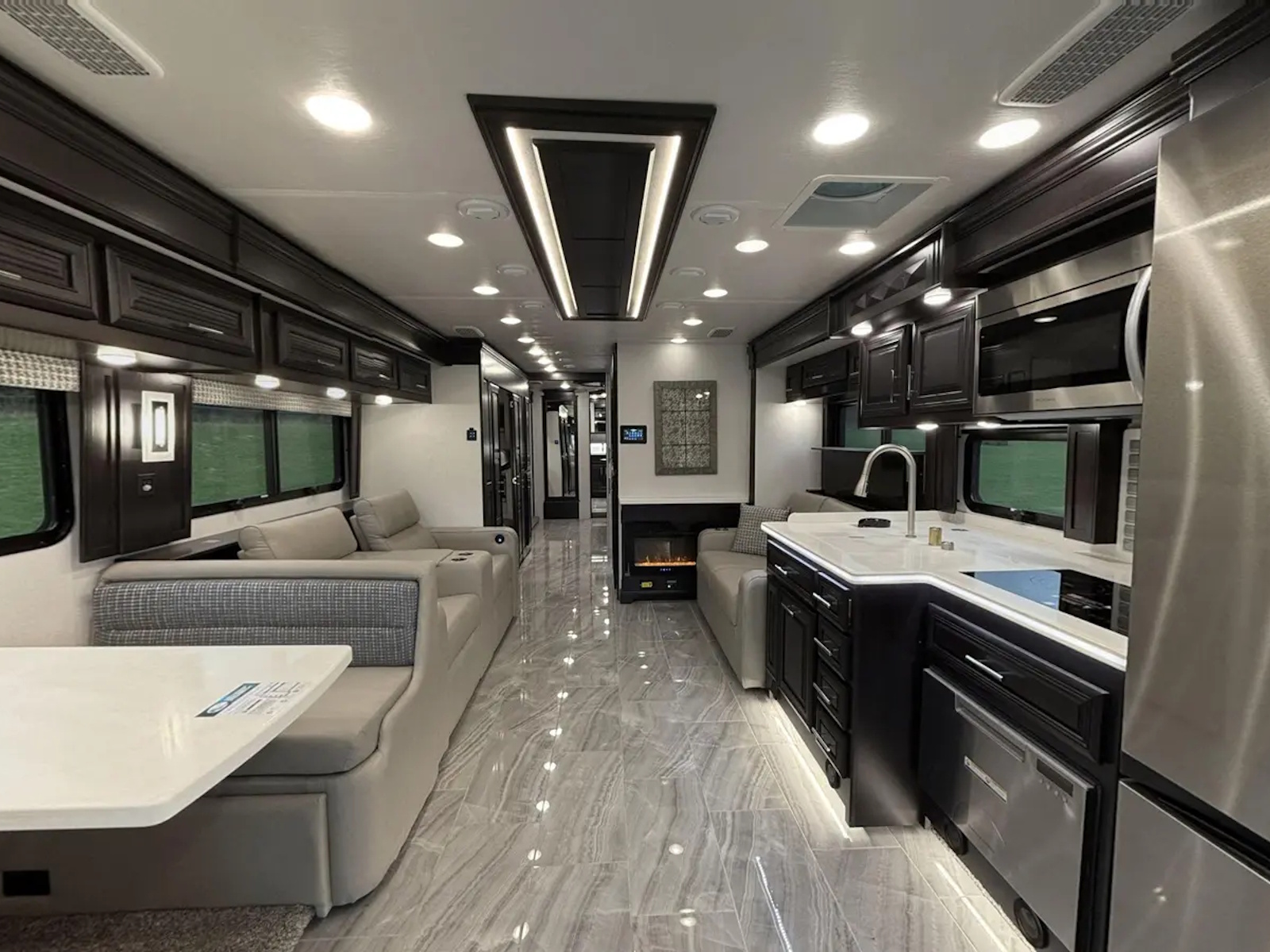 The Berkshire XLT 45CA is a three-slide bunkhouse model with two full bathrooms. The large full rear bath includes a roomy shower, vanity with dual sinks overhead cabinets, and stacking washer/dryer. The main bedroom is just off the bath, with a slideout, 72" x 80" Tilt-a-View king bed, plus a dresser, wardrobe cabinet, 43" TV, and overhead cupboards. The second full bath has a shower, vanity sink, medicine cabinet, and commode. Across across from this bathroom is the bunk room/wardrobe combo. The kitchen is fully equipped, with a convection microwave, induction cooktop, and residential-style refrigerator. Just over the cockpit, you'll find a unique drop-down bed for an added sleeping surfac