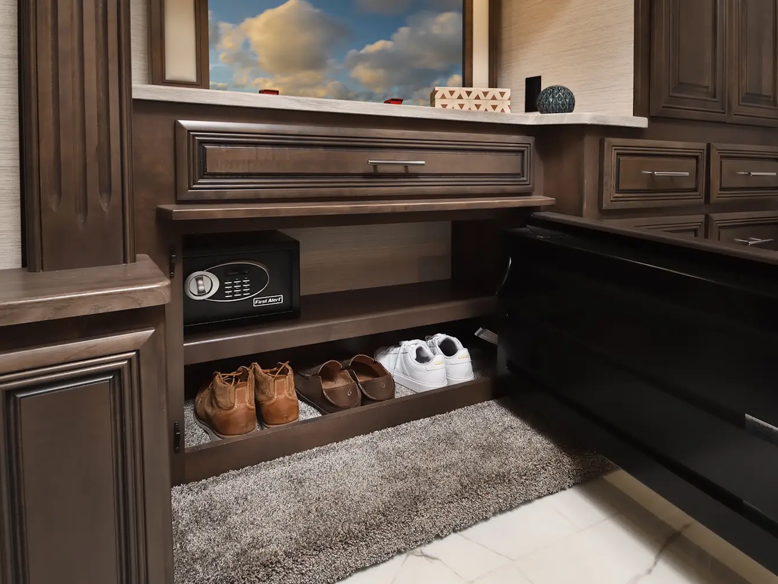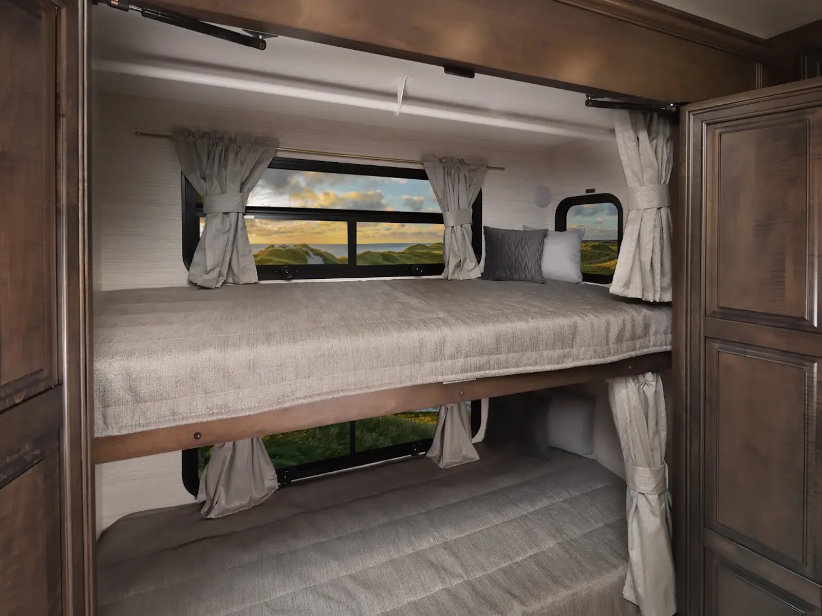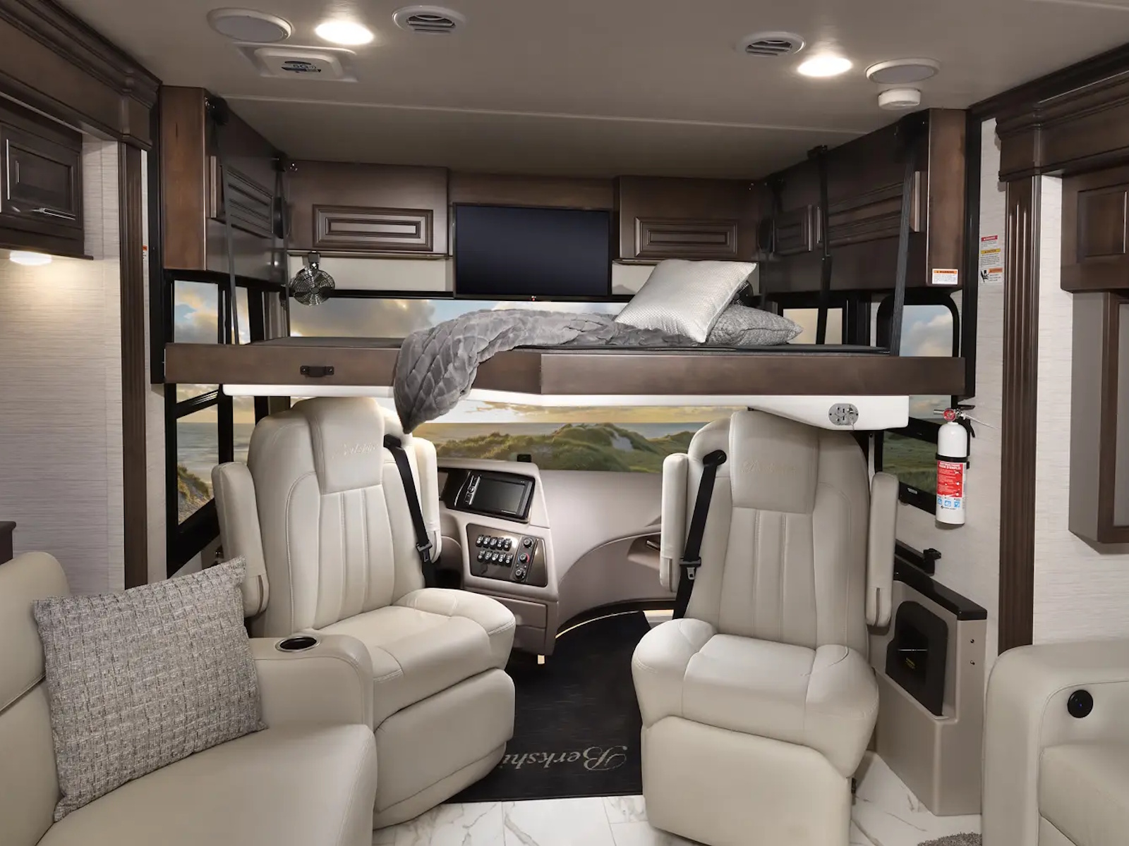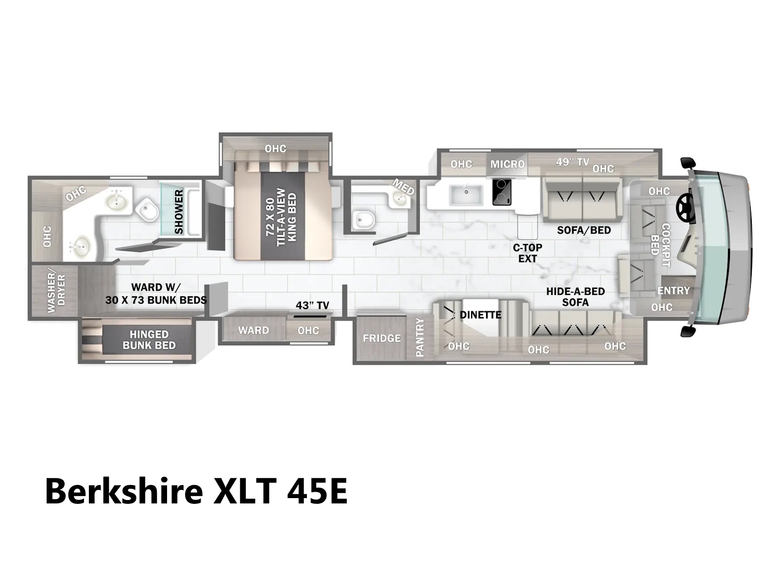 The Berkshire XLT 45E is a five-slide bunkhouse model. The large full rear bath includes a shower, vanity, cabinets, and stacking washer/dryer. Within the bathroom is a slideout bunk room/wardrobe combo. Each bunk is 30" x 73" and has its own TV. The main bedroom has a slideout, 72" x 80" Tilt-a-View king bed, plus a dresser, wardrobe cabinet, 43" TV, and overhead cupboards. Moving toward the living area is a half bath with vanity sink, medicine cabinet, and commode. The kitchen is fully equipped with a convection microwave, induction cooktop, and residential-style refrigerator. Just over the cockpit, you'll find a unique drop-down bed that provides an additional sleeping surface.