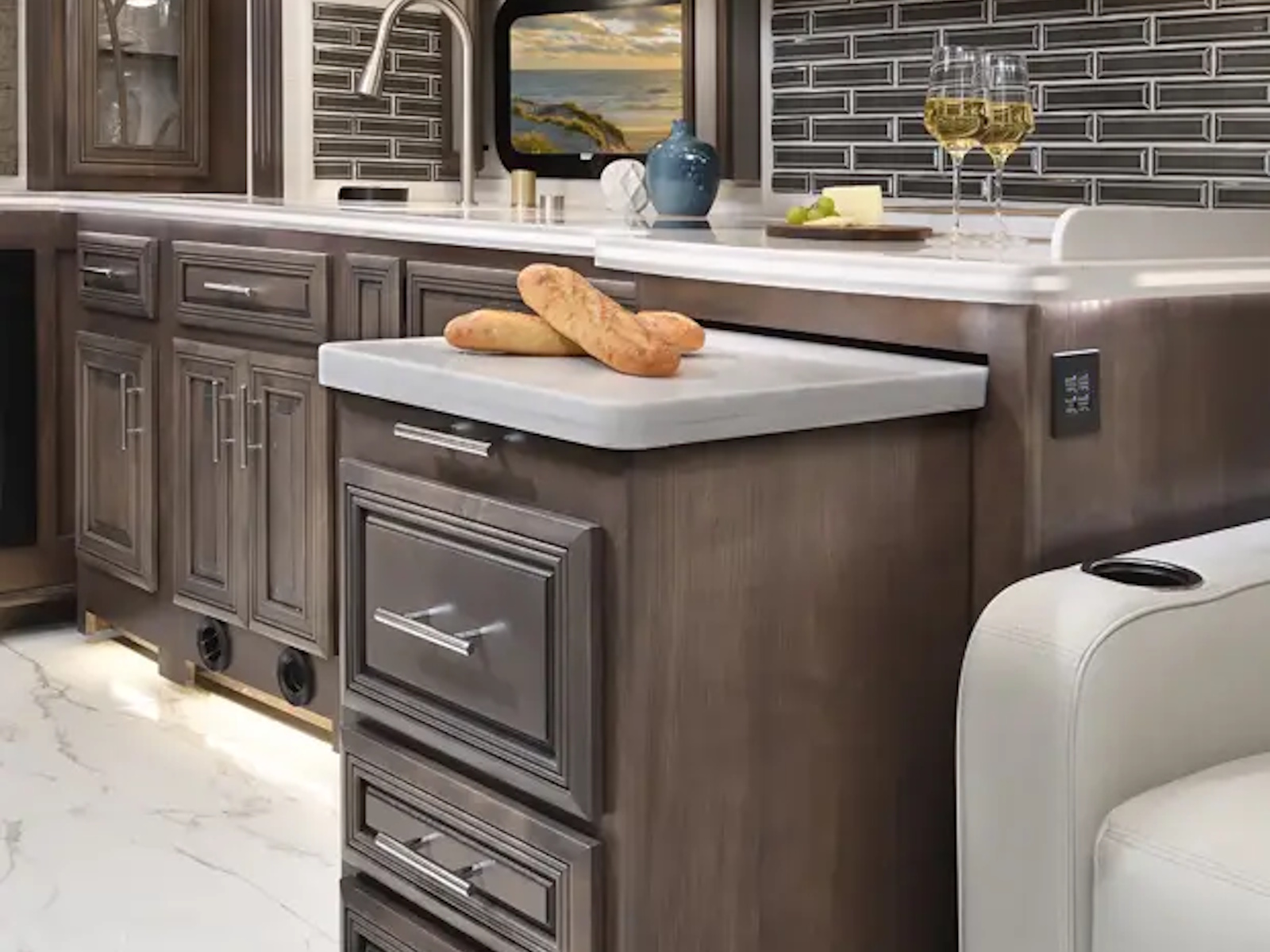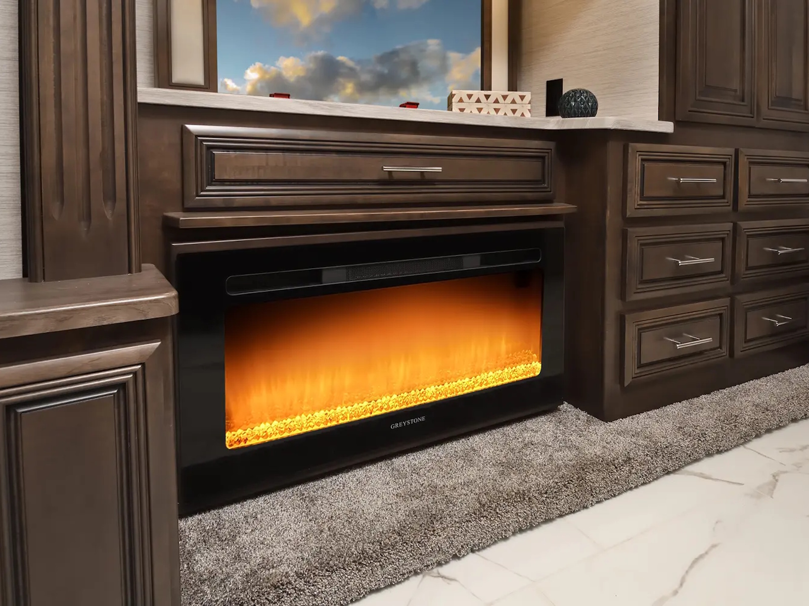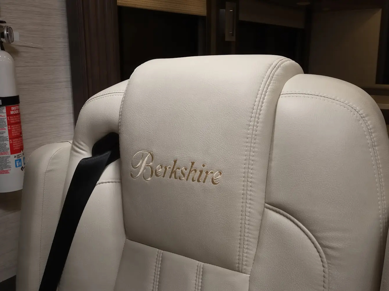The Berkshire XLT 45E is a five-slide bunkhouse model. The large full rear bath includes a shower, vanity, cabinets, and stacking washer/dryer. Within the bathroom is a slideout bunk room/wardrobe combo. Each bunk is 30" x 73" and has its own TV. The main bedroom has a slideout, 72" x 80" Tilt-a-View king bed, plus a dresser, wardrobe cabinet, 43" TV, and overhead cupboards. Moving toward the living area is a half bath with vanity sink, medicine cabinet, and commode. The kitchen is fully equipped with a convection microwave, induction cooktop, and residential-style refrigerator. Just over the cockpit, you'll find a unique drop-down bed that provides an additional sleeping surface.