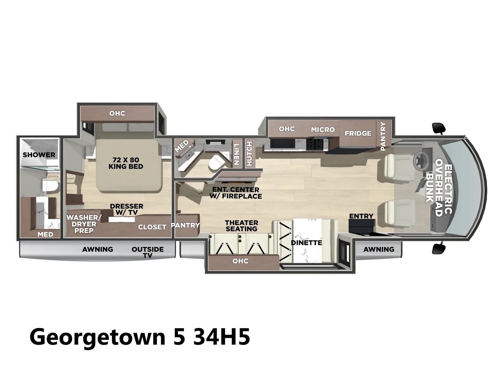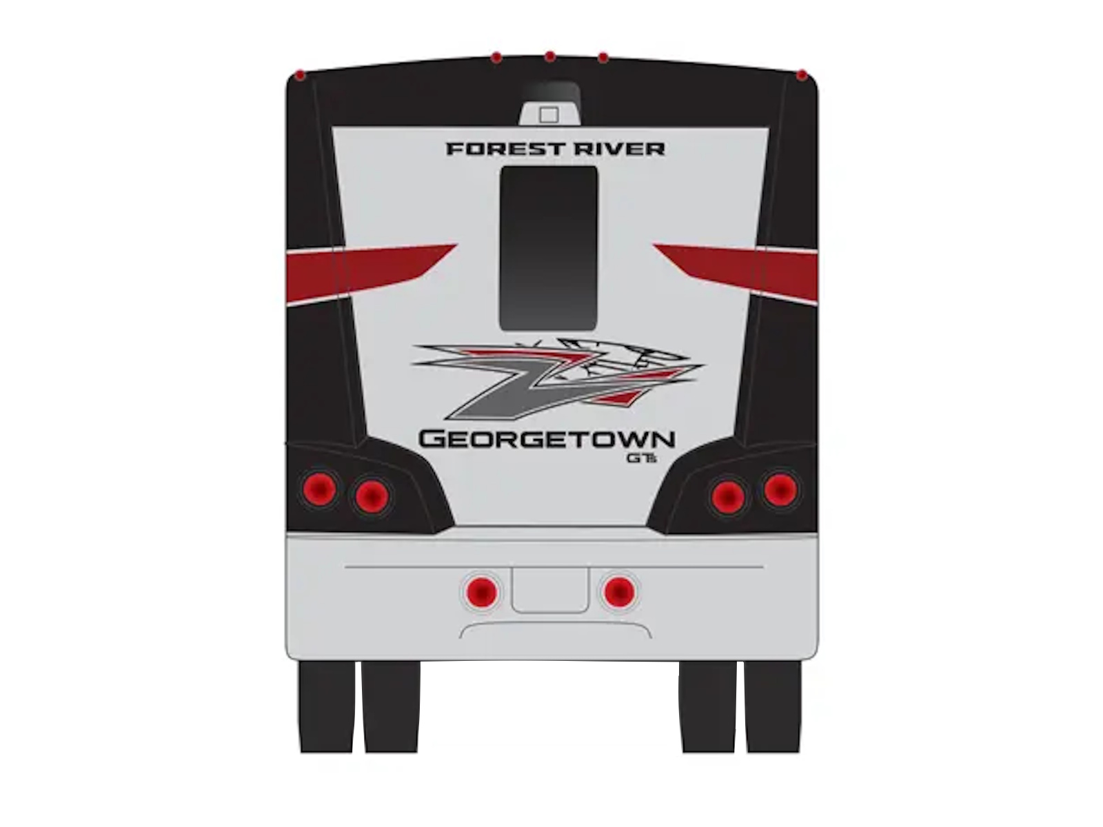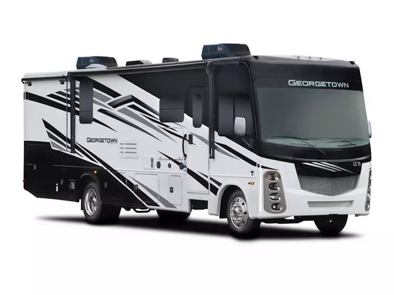 The Georgetown 34H5 by Forest River offers a unique opposing slide floorplan with 1 ½ baths. Relax in the power theater seats (with heat & massage) or enjoy the well-equipped kitchen and king bedroom. This class A motorhome is ideal for extended road trips.