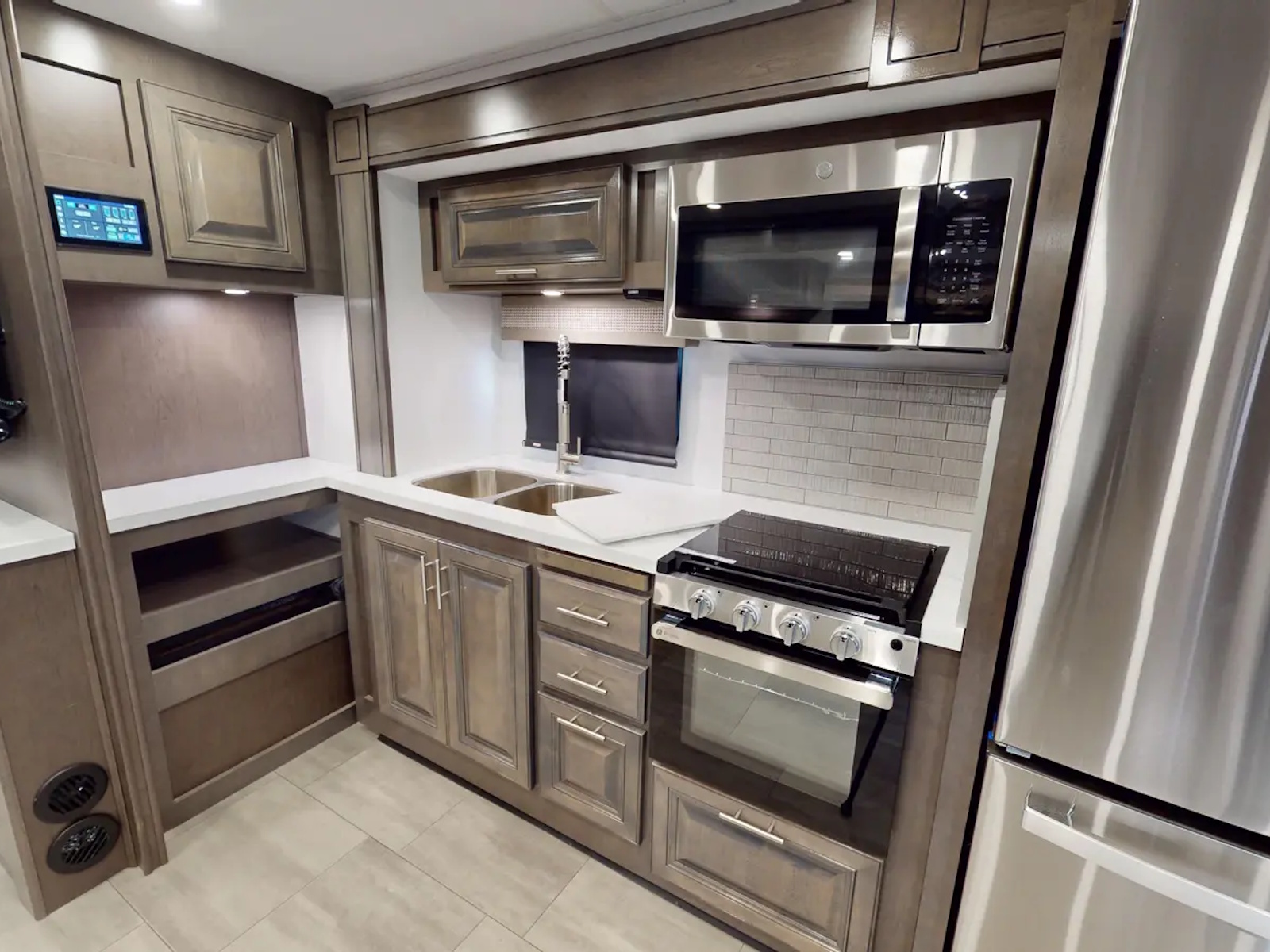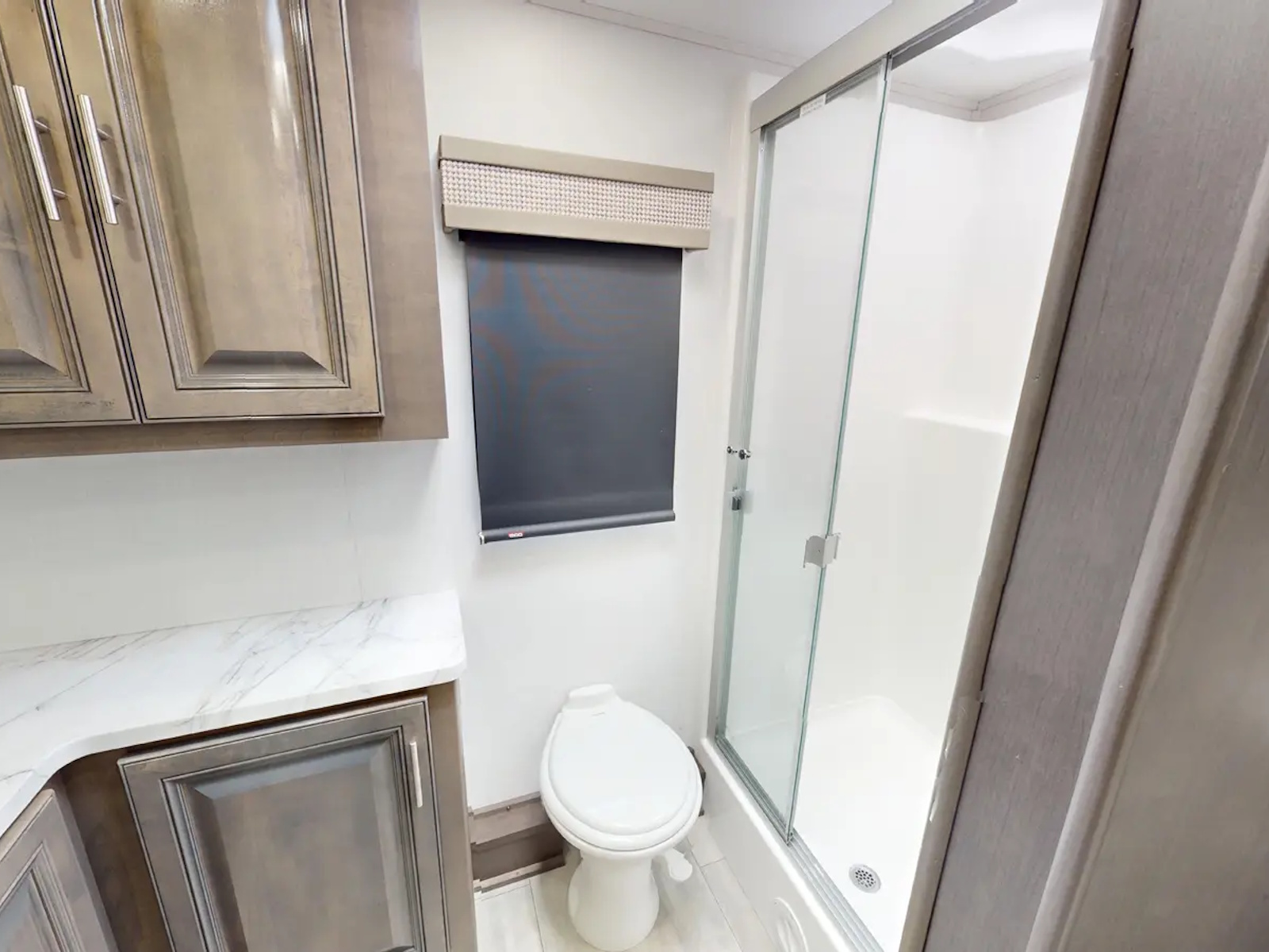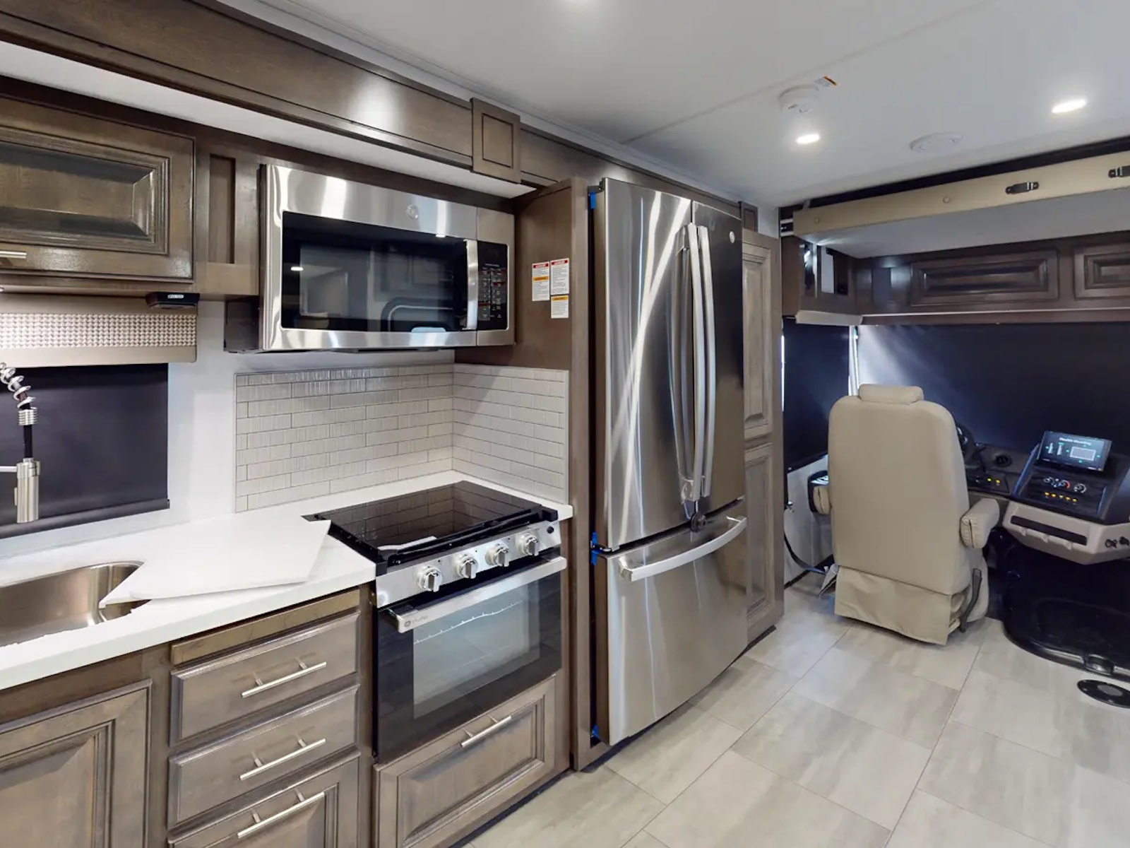 The Georgetown 34H5 by Forest River offers a unique opposing slide floorplan with 1 ½ baths. Relax in the power theater seats (with heat & massage) or enjoy the well-equipped kitchen and king bedroom. This class A motorhome is ideal for extended road trips.