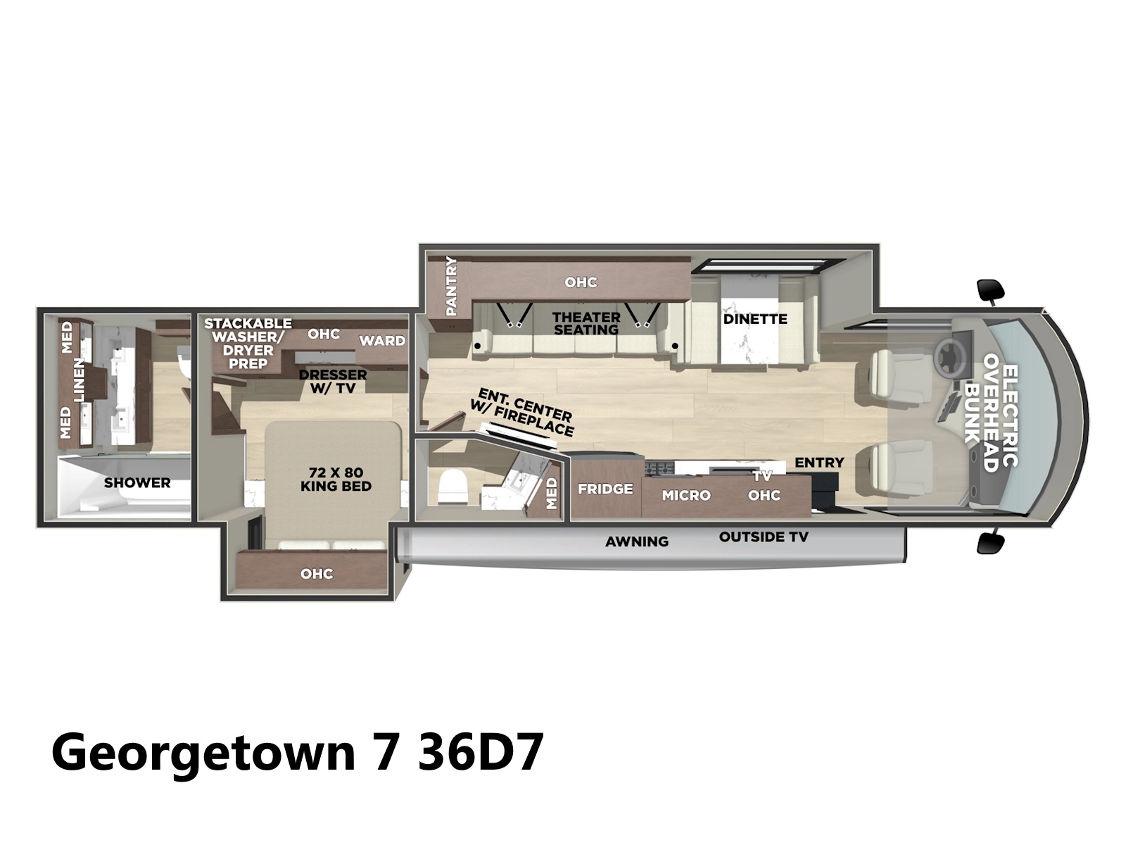 The Georgetown 36D7 by Forest River is designed for comfort and entertainment with 1 ½ baths and four theater seats. The kitchen features a farmhouse sink, 3-burner cooktop, microwave, and refrigerator. Enjoy the TV from the reclining, heated, and massaging theater seats. A ½ bath is in the main living area, and a full bath with a double bowl vanity is off the bedroom, which features a king bed and optional washer/dryer. The cab offers swivel captain seats, a table, and a power overhead bunk