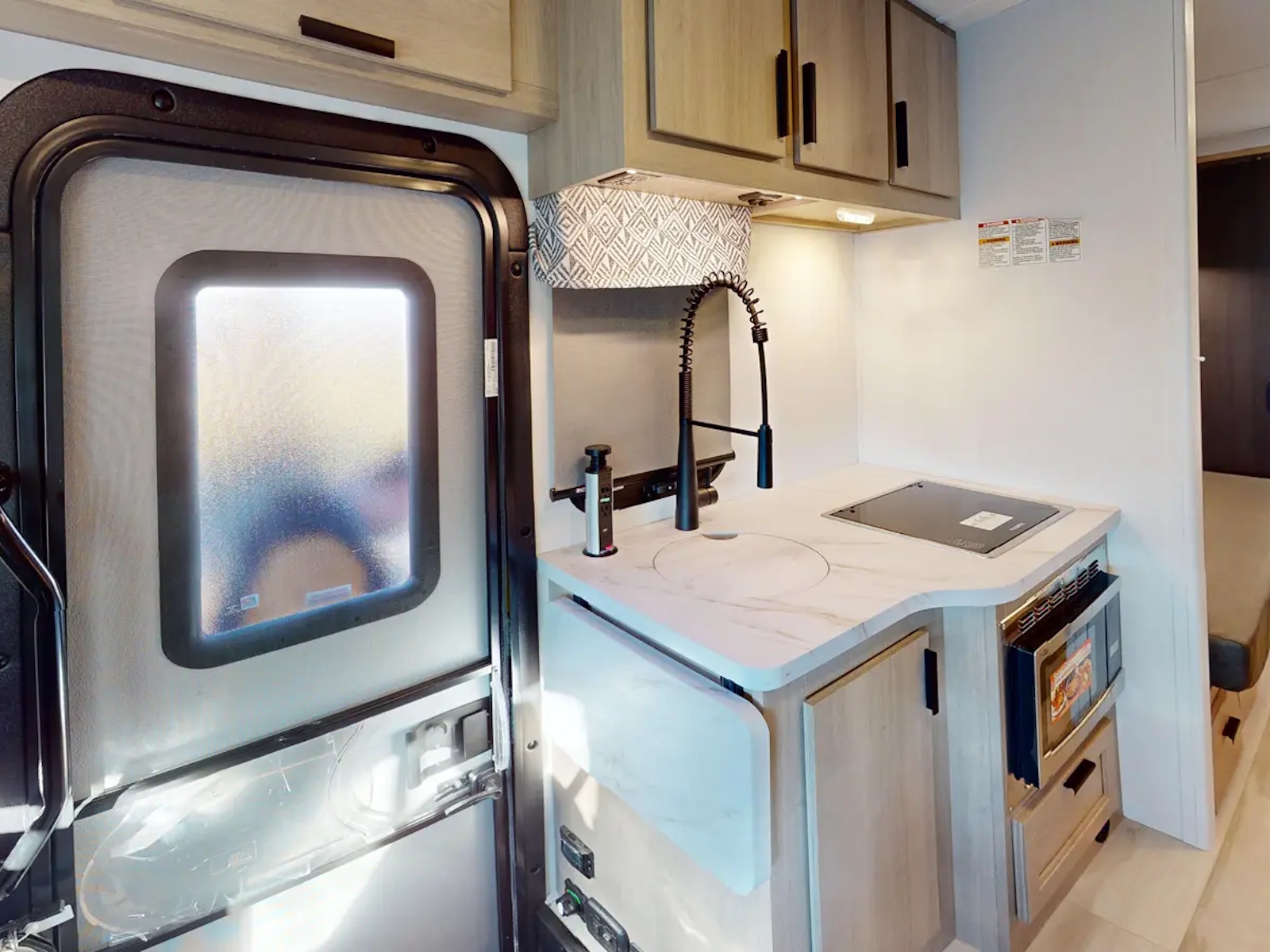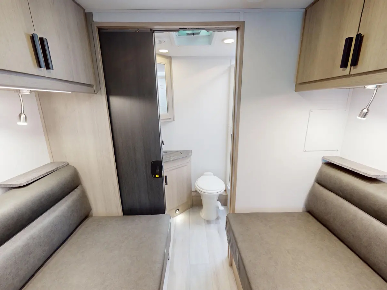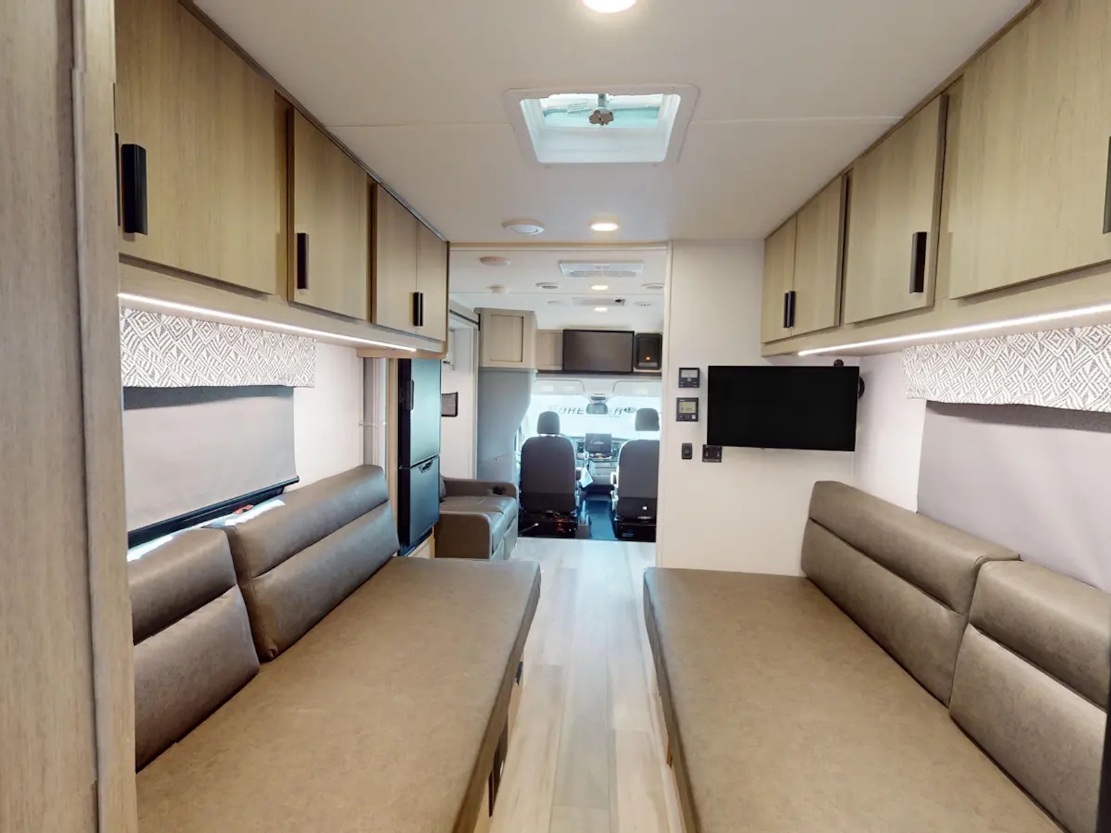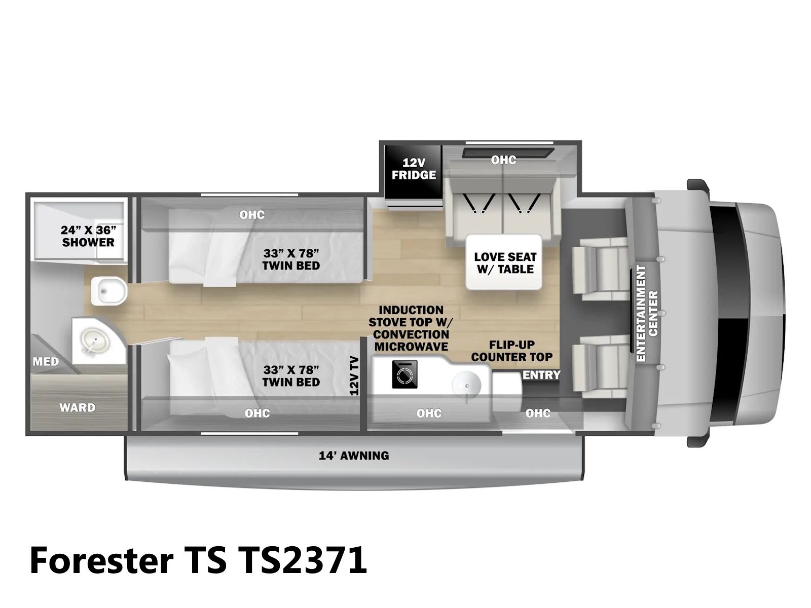 The Forester TS2371 is the perfect couple's coach with twin beds, a rear full bathroom with a shower, and a wardrobe for your things. A love seat with table is perfect for dining, with a fully equipped kitchen that includes a stovetop, convection microwave, flip-up countertop for extra space, and a 10.7 CU FT 12 V residential-style stainless steel refrigerator. The rear bath includes a 24" x 36" skylight shower, commode, vanity sink with extended countertop, and medicine cabinet.