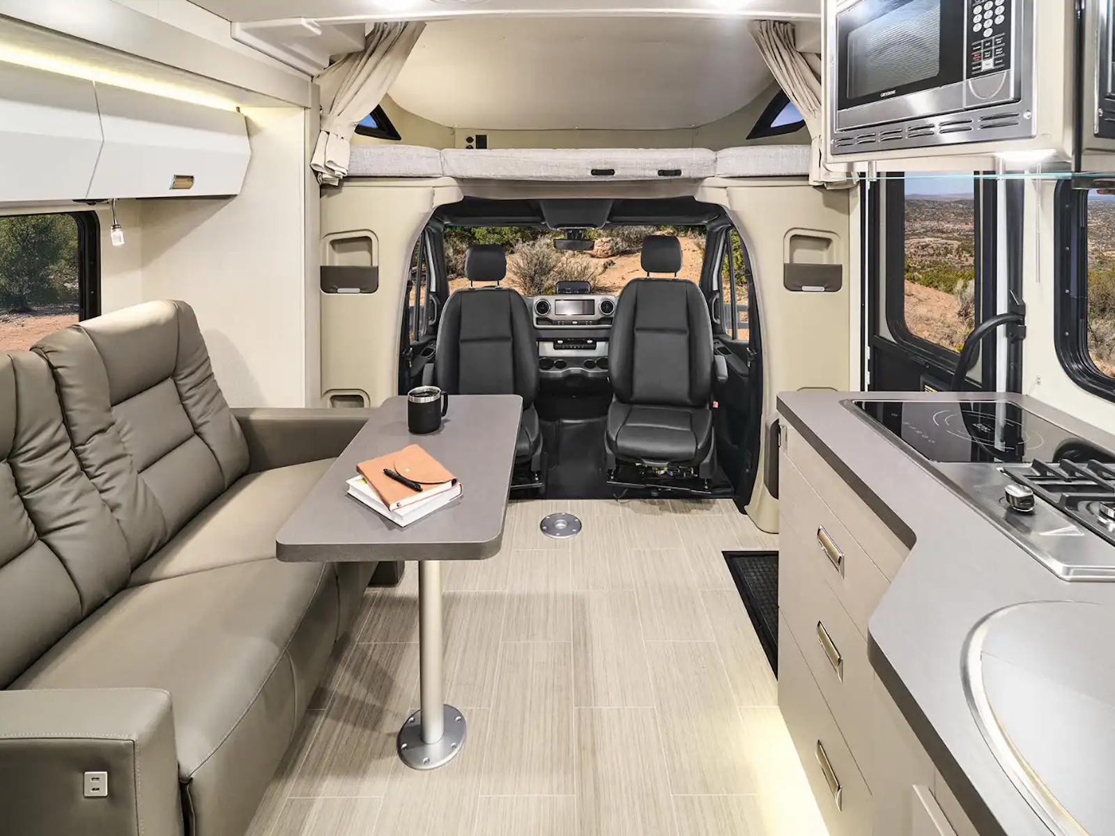 Dimmable LED ceiling lights, overhead accent lighting, and toe kick accent lighting | Blackout roller shades (lounge & dining) | Tinted coach windows | Winnebago Connect™ 10 in touchscreen w/available companion mobile app | Powered roof vent w/rain cover, electric lift, remote control, thermostat operation (front bunk/lounge) | Fold down dining table and chairs | Power reclining theater seating w/fold down center armest w/2 cupholders, USB charging outlets, and removable swivel lap tables | JBL Bluetooth® soundbar | Satellite system ready | Amplified digital TV antenna | Roof wiring access port | 120V, 12V, USB-A, USB-C charging ports throughout | Assist bar | Roll vinyl flooring throughout | Soft vinyl ceiling | Cabover bunk 49 in x 75 in (n/a w/Low-profile Front Cap) | TrueComfort+ sofa w/removable pedestal table (n/a w/dual recliners) | Optional Equipment: Power dual recliners w/removable pedestal table and USB charging outlets