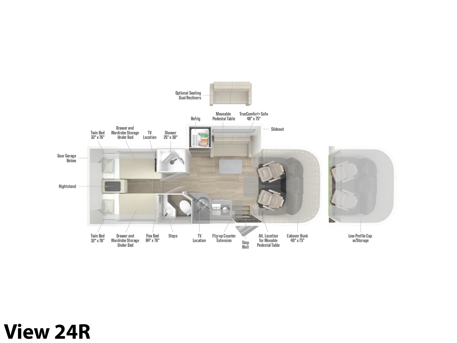 The View®and Navion® 24R feature sleek new exterior options and a stylish, modular interior with increased cargo-carrying capacity to bring more gear along for the journey. Inside, enjoy a luxurious TrueComfort+ sofa or optional dual recliners, a spacious cross-aisle bath, rear twin beds that convert to a large Flex Bed, and a full-width gear garage for easy-access pass-through storage. Built-in Winnebago Connect™ makes it easy to monitor and manage your RV systems with confidence and features smart automations for energy-efficient climate control.
