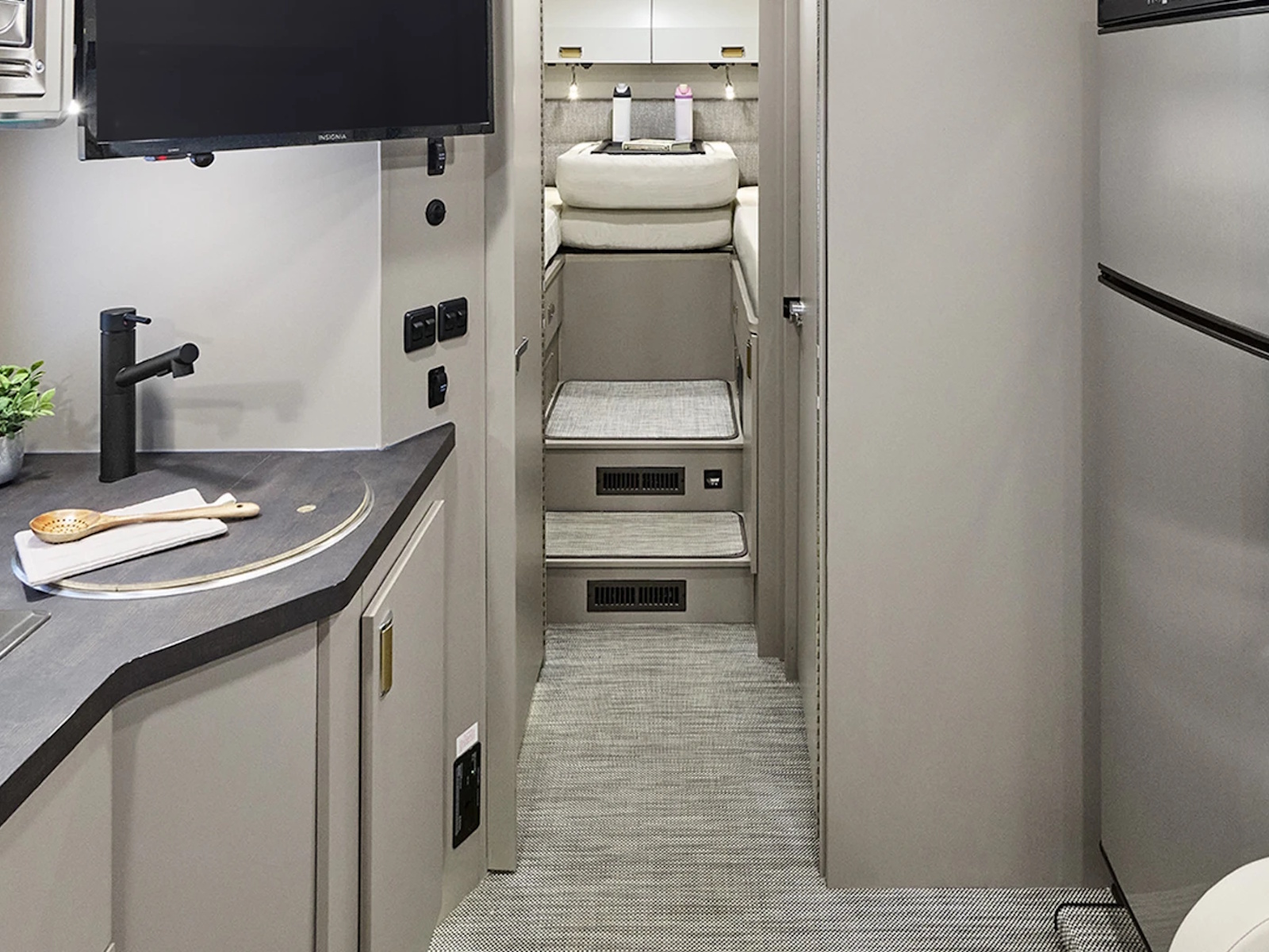 - Open the door and discover a modern, open, and versatile space. Explore innovative amenities like the cross-aisle bath (which creates a larger bathroom when the doors are open), a private bedroom with twin beds that convert to a Flex Bed, and a TrueComfort+ sofa or optional power-reclining dual recliners.