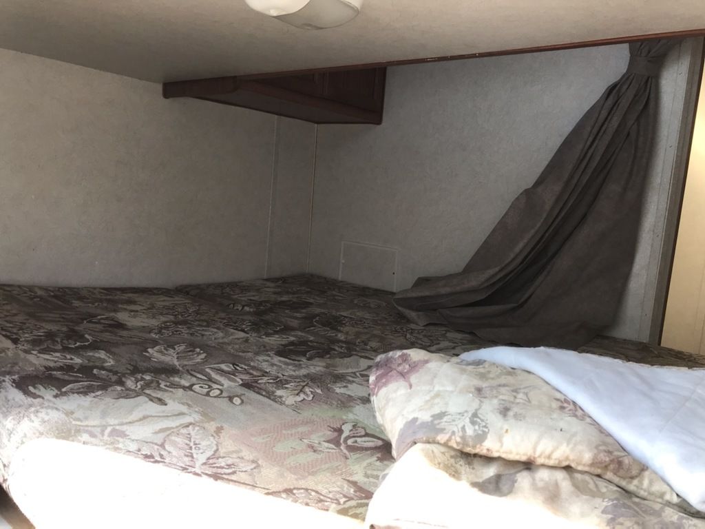 Front queen, 2 rear bunks, sofa/dinette slideout, roof AC, new linoleum floor, loaded.