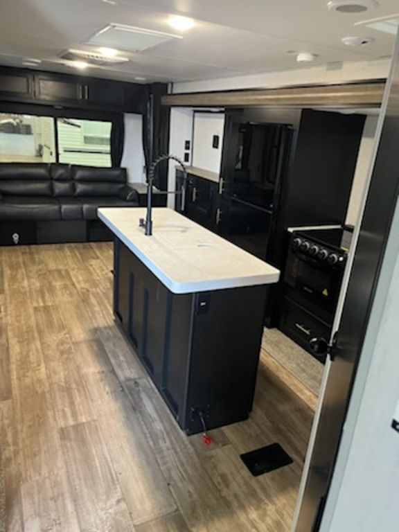 Two opposing super slides give you the functionality of open floorplan living space. The booth dinette and two recliners greet you when you enter and the large rear sofa and recliners are positioned for visiting and resting. Cooking is a breeze with our chef’s kitchen and center island. Movement is convenient as you go from your bath to your large master queen suite. Enjoy the exterior of the unit under your power awning with LED light strip, tv hookup and exterior speakers.
