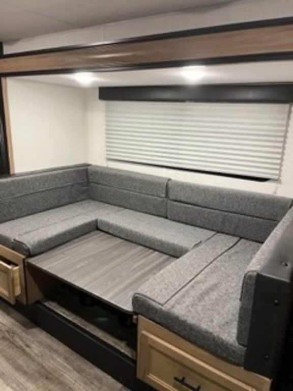 The 17JG is the embodiment of the family camper. The large U-shaped dinette offers great seating, full-size pull-out drawers, as well as additional sleeping for two adults. The master queen bed offers comfort, while housing huge under bed storage. A functional modern chef’s kitchen, and bathroom round out the interior of this class leading unit. The exterior under awning space provides ample entertaining space with the exclusive Pup kitchen, LED Power awning, exterior speakers, and TV bracket.