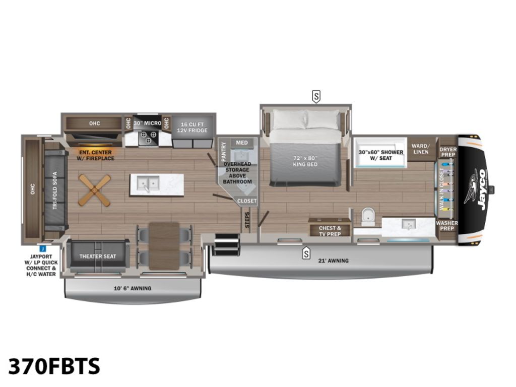 Move to a new level of luxury with Jayco’s Eagle Fifth Wheel. It takes the best of the Eagle HT Fifth Wheel and adds in even more luxurious touches like a 24-inch GE stove, a dual 15K whisper quiet A/C, legless free standing dinette with pivoting and extension function for a desk, and the JayPort system with 22-inch griddle, deep sink and hot/cold water connections.