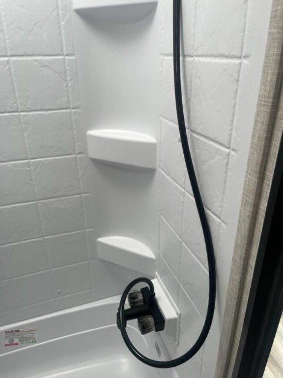 - Shower curtain with curved shower track (select models)