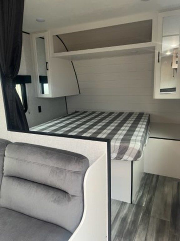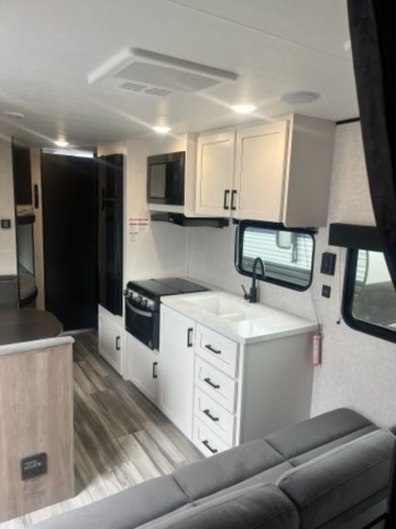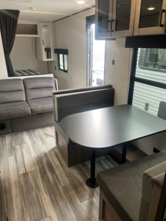 Inside, the Jay Flight SLX boasts some luxe residential features. Solid hardwood cabinet doors and drawers, with hidden cabinet hinges, offer a modern and sleek look. We continue to keep our owner's needs at the top of our mind, by offering oversized cabinets for increased storage space. In addition, you'll find maximized storage underneath the bed or bunk beds, under the dinettes, under the jack-knife sofas and even a neatly finished and lit exterior passthrough storage space. And just like our larger units, the Jay Flight SLX comes standard with a 60,000 BTU on-demand tankless water heater, for comfortable water temperatures as needed.