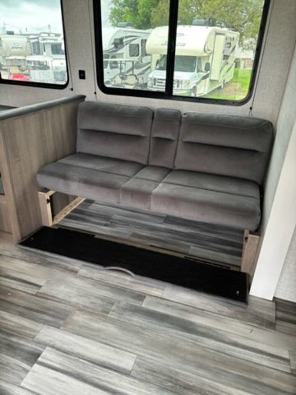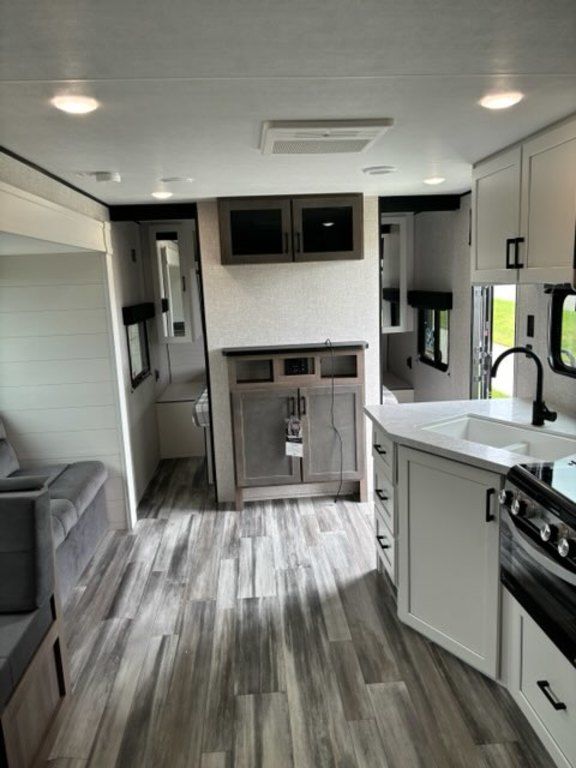 Inside, the Jay Flight SLX boasts some luxe residential features. Solid hardwood cabinet doors and drawers, with hidden cabinet hinges, offer a modern and sleek look. We continue to keep our owner's needs at the top of our mind, by offering oversized cabinets for increased storage space. In addition, you'll find maximized storage underneath the bed or bunk beds, under the dinettes, under the jack-knife sofas and even a neatly finished and lit exterior passthrough storage space. And just like our larger units, the Jay Flight SLX comes standard with a 60,000 BTU on-demand tankless water heater, for comfortable water temperatures as needed.