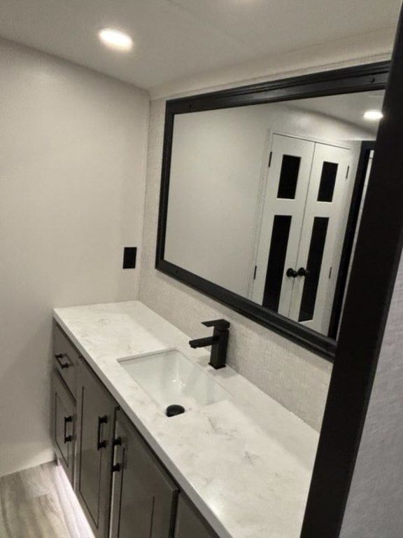 - Hidden hinges, magnet latches and soft close cabinet doors and drawers Integrated under-mount sink and lever faucet in main bathroom