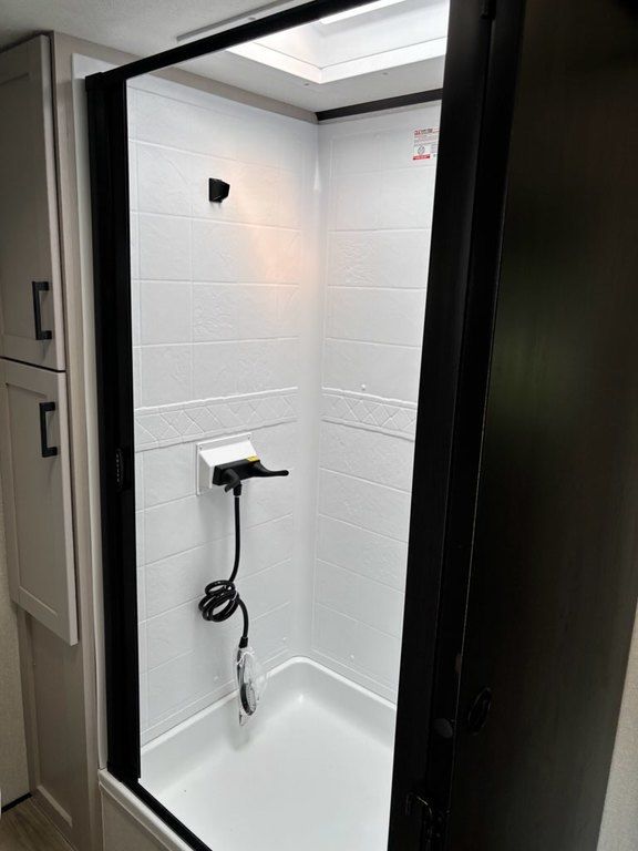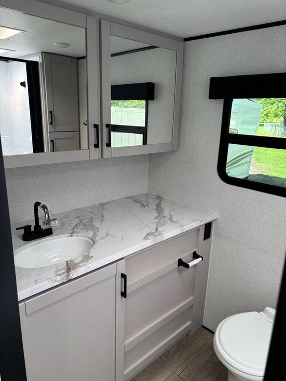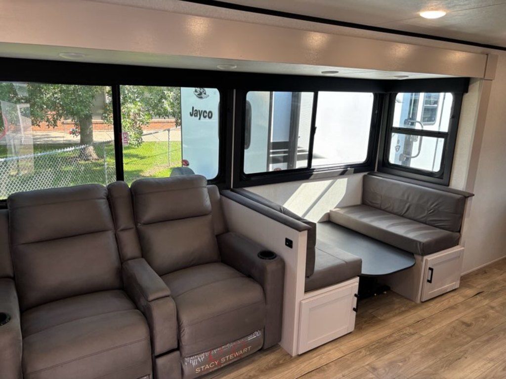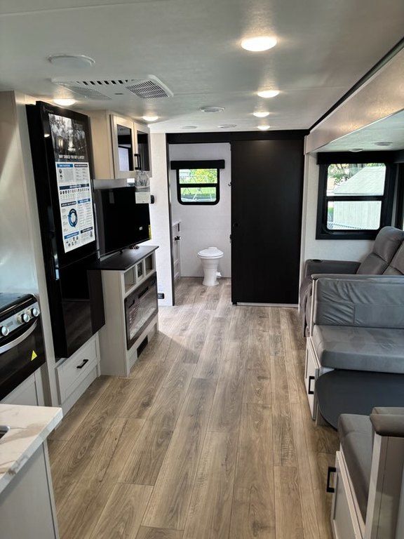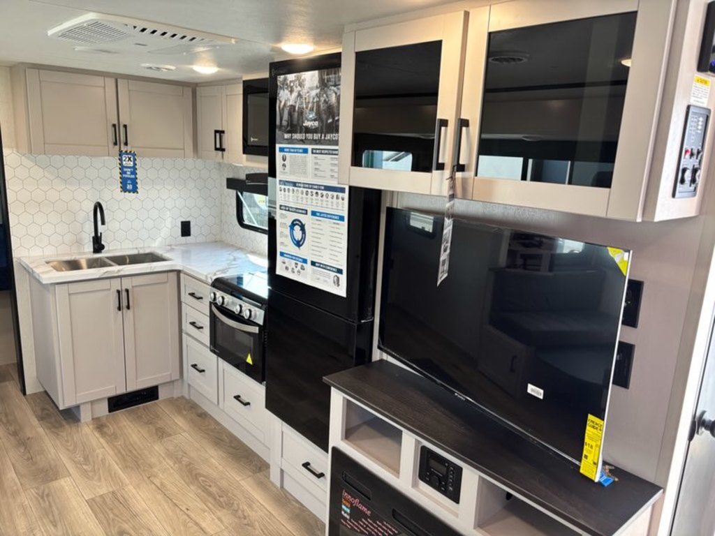 The amenities for 2026 don’t stop there! In the kitchen area, you'll find seamless countertops throughout, a stainless-steel sink with a large window. You'll also be blown away by the all-new InVision Suite appliance package with an 11 cu. ft. 12V fridge, standard in all Jay Feather models. This fridge has a shiny, black glass front with a two-door fridge over the freezer. Store more on the go with oversized cabinet doors and drawers. The cabinet doors are attached with hidden hinges to give each Jay Feather that sought-after residential look and feel.