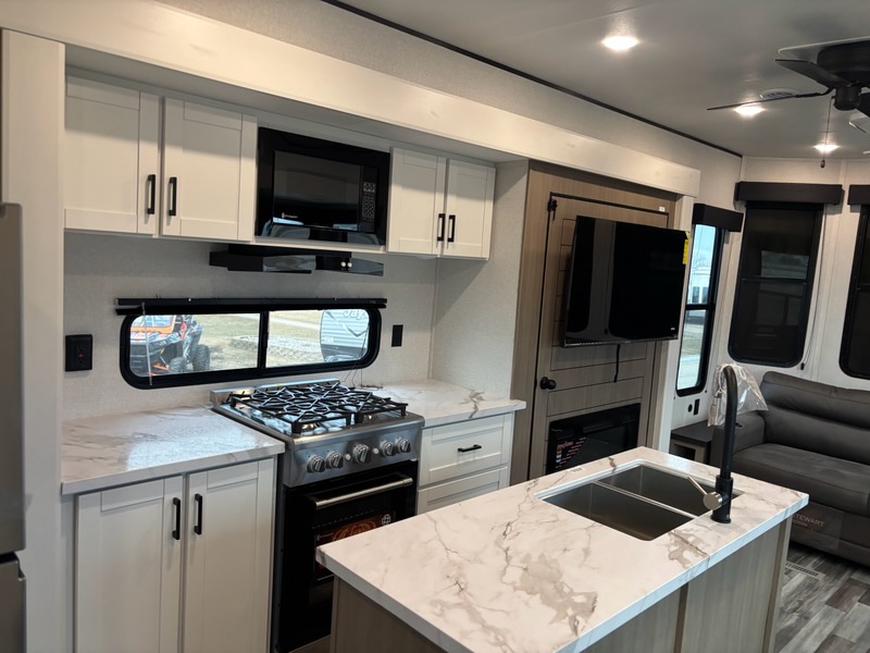 The kitchen rivals what you’d find at home. The residential-sized refrigerator keeps your groceries fresh for extended stays, while the 4-burner stove with an oversized oven and 30-inch over-the-range microwave make cooking for a crowd easy and enjoyable. Every cabinet door and drawer is crafted from real hardwood maple with hidden hinges, offering a sleek, high-end finish that blends style with durability.