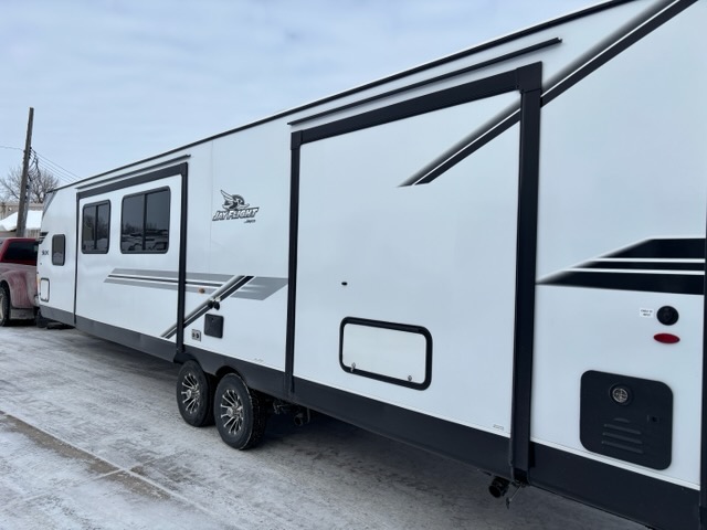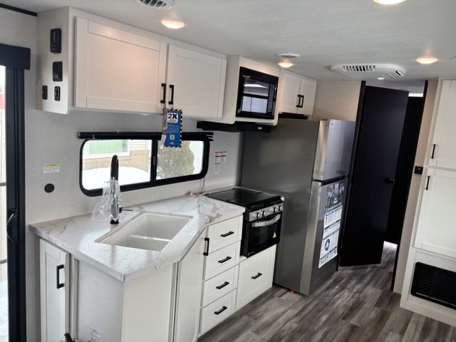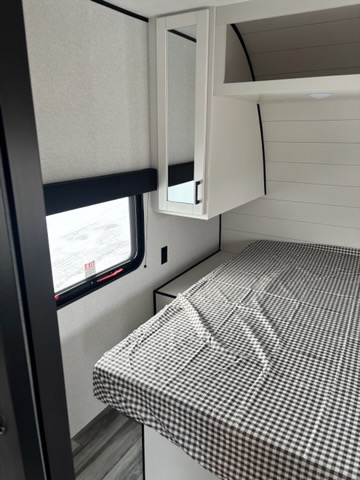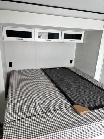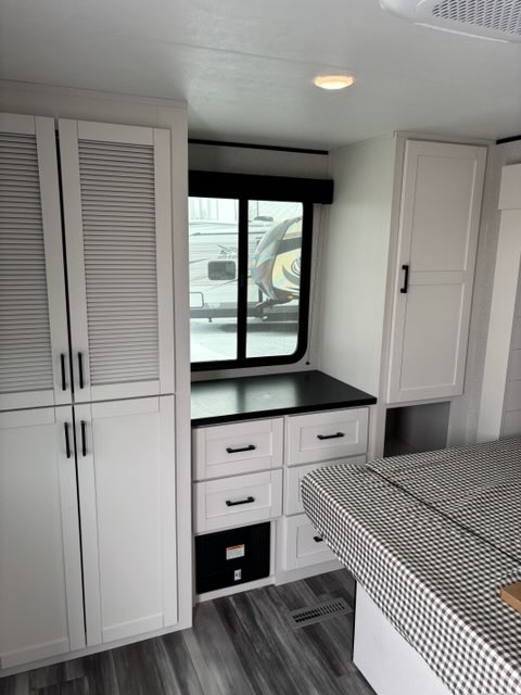 Inside, you’ll find solid hardwood cabinet doors with hidden hinges, giving the space a modern, residential feel. Oversized cabinets and under-bed storage ensure there’s room for everything you need, while the lit exterior passthrough storage makes packing and unpacking a breeze.